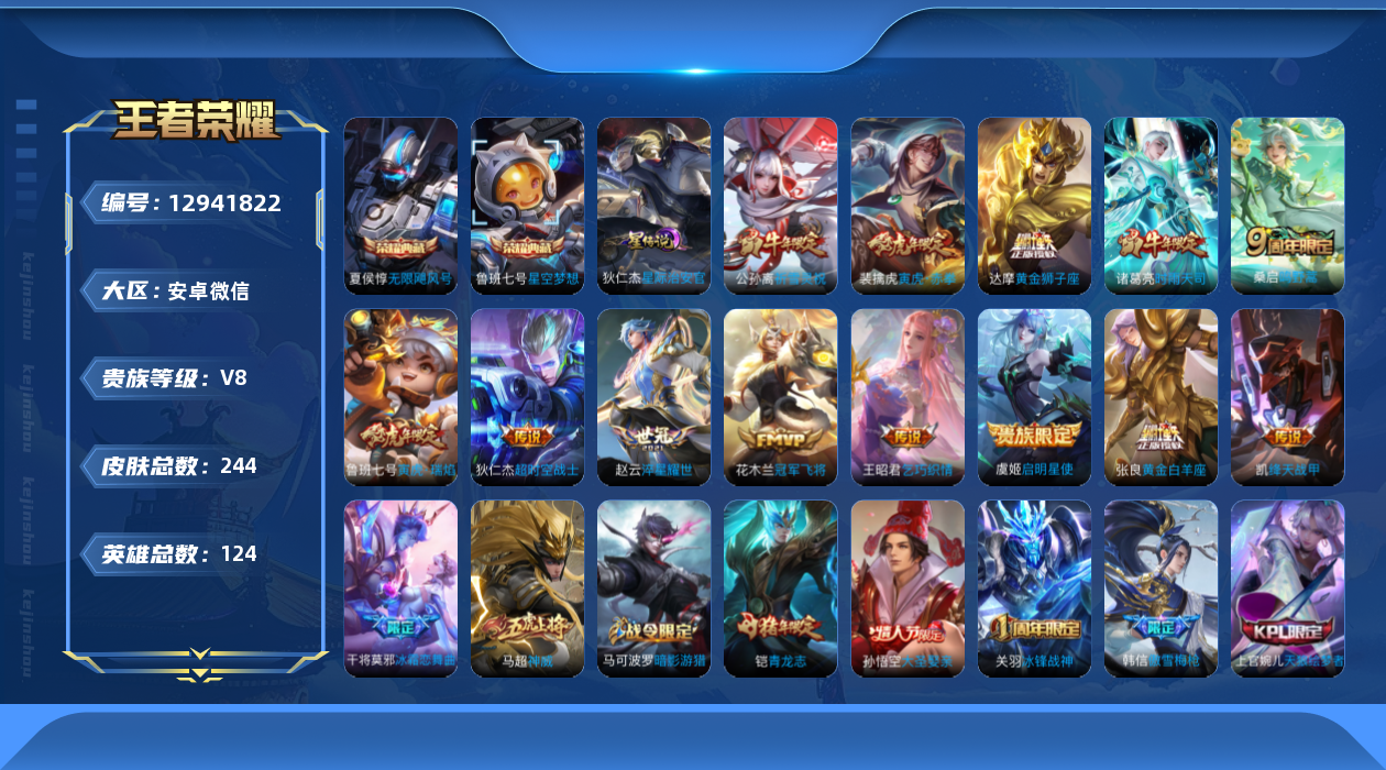 - PX_2095241-安卓Q-可二次-贵8-125英雄-268皮肤-2典藏-16传说-76限定-6按键-贵族积分77083-营地ID:536983752/武则天-虞姬神鉴启示录-霜月吟-绛天战甲-炽阳神光-启明星使-地狱之眼-地狱火-海洋之心-久胜战神-黄金狮子座-黄金射手座-一念神魔-云鹰飞将-时雨天司-白虎志-愿照·九州拓-幻光神枪