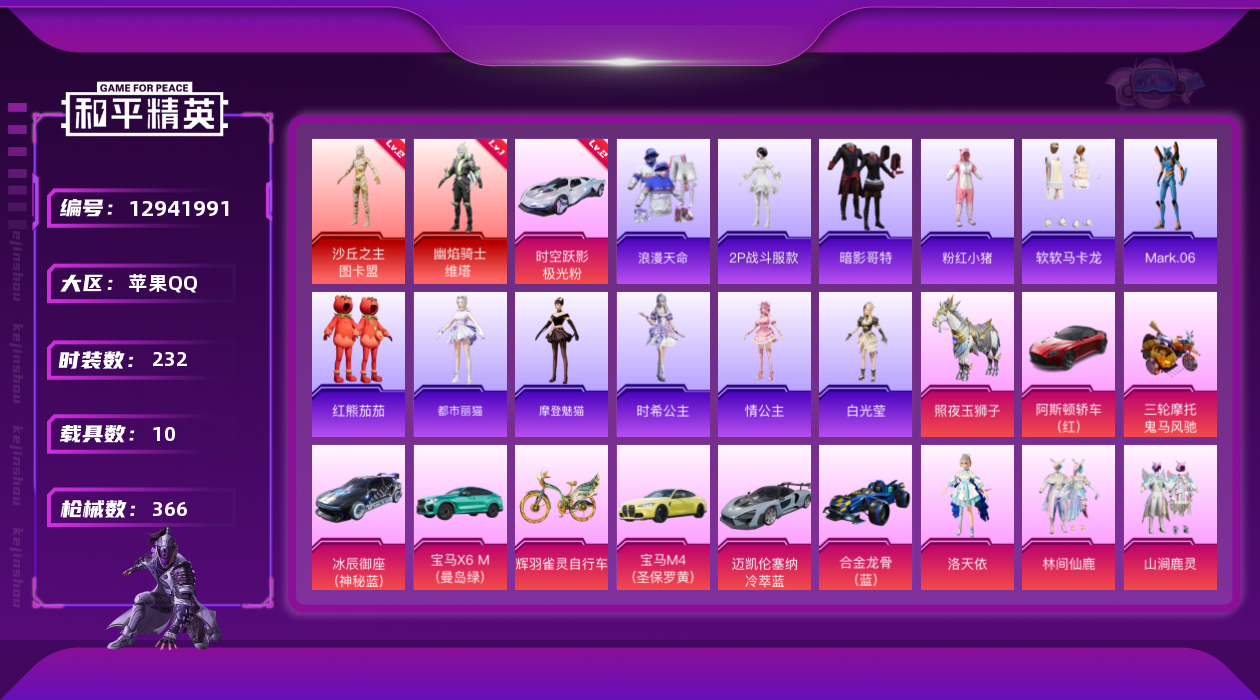 - PX_2095326- 苹果手Q-9王牌印记-7粉装-7特效枪-0载具-54161热力值-122套装-156枪皮-3卓越印记-3传奇印记 【7粉装】,梦幻火箭,初号机款机体服,洛天依,沙场疾风,冰霜白皇,炙焰红王,创世·救赎 【7特效枪】AKM-炫紫旋律-7级 M416-风花雪月-4级 M416-五爪金龙-7级 Kar98K-巳巳如意-5级 DP-28-暗夜鎏金-2级 MG3-洛神天依-5级 平底