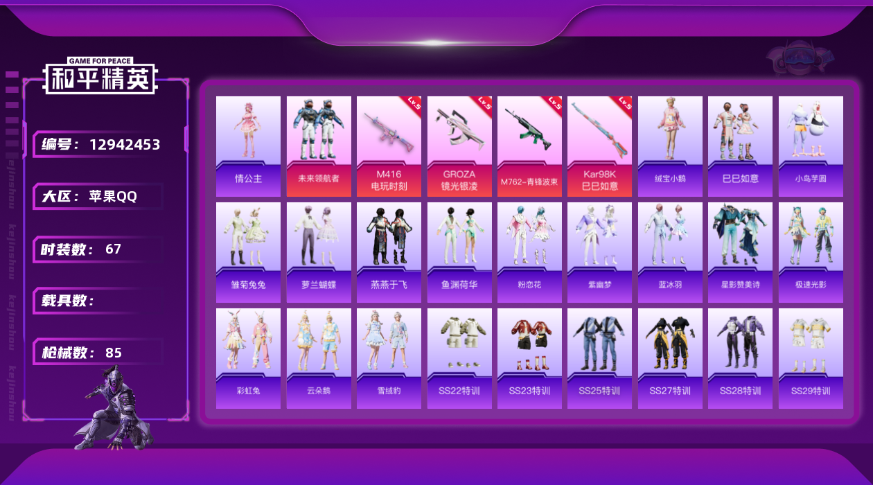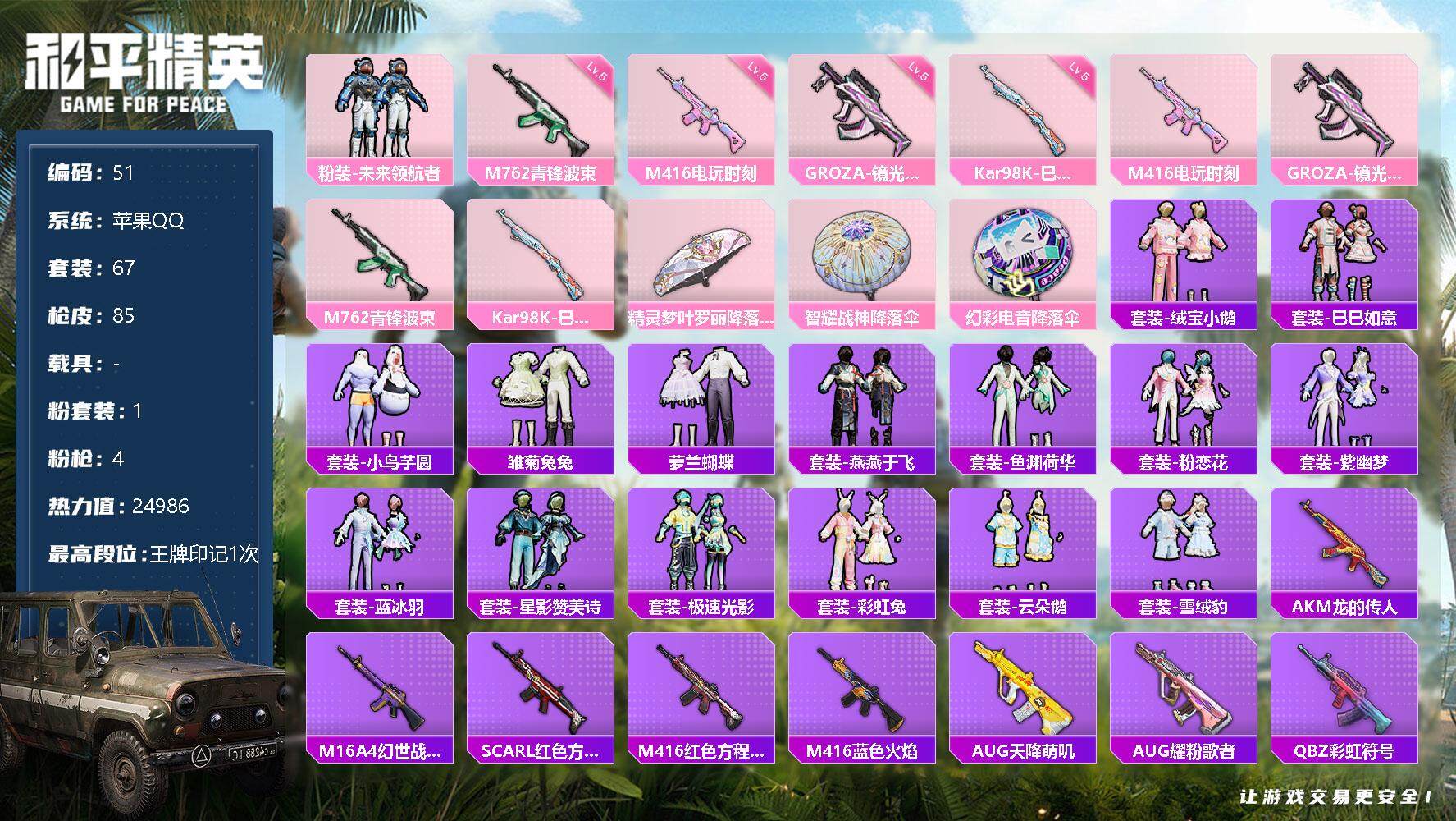 [12942453]MQ805 苹果 手Q-1粉装-4特效枪-0载具-0粉色飞行器-24986热力值-1王牌印记-67套装-85枪皮