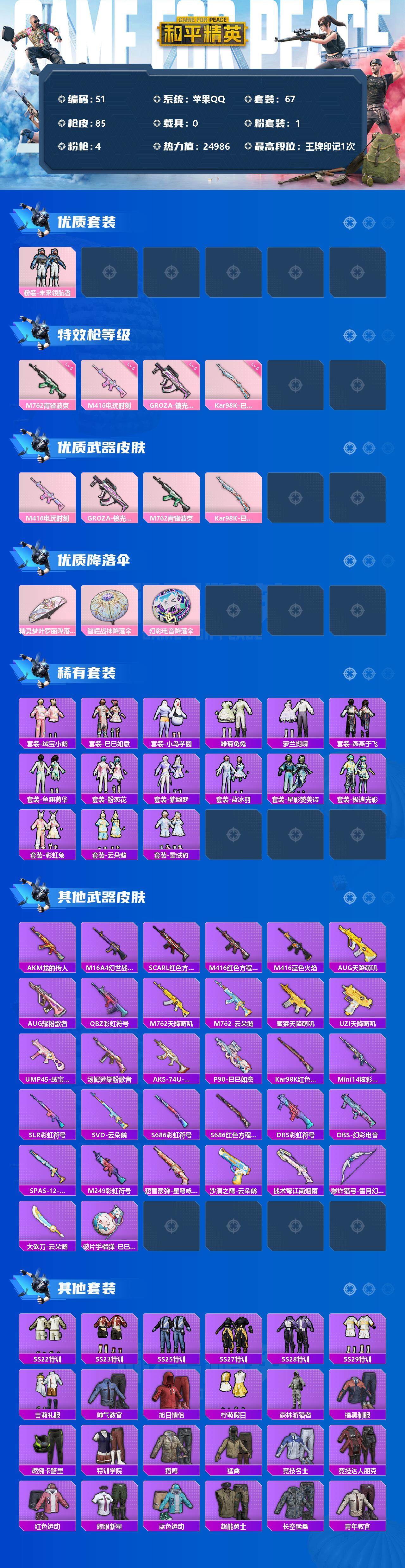 - [12322324]2粉装 5特效枪 8印记 可二次 可修改实名 身法装备:Mark.06(新蓝螳螂) 优质装备:天使彩虹糖,SCAR-L-锦绣绵绵,萨利娅,M16A4-晶梦幻蝶,AUG-暖羊咩咩,Kar98K-巳巳如意 稀有枪皮:DP-28-豹影疾电 五级特效枪:五级Kar98K-巳巳如意,五级DP-28-豹影疾电,五级M16A4-晶梦幻蝶,五级AUG-暖羊咩咩,五级SCAR-L-锦绣绵绵 紫色装扮:SS30特训套装,SS31特训套装,SS33特训套装,青涩时光,顶瓜瓜,吉莉礼服,青年教官,魅力单车,黄色伏地魔,黄色运动,黑色伏地魔,龙的传人,龟仙人,冰河战士,龙魂突击队,蝶变,香桃花海,霓虹街区,长空猛禽,蓝海鲸歌,深蓝色名流,灼焰舞者,海岛探路者,战地督导,柠萌假日,橘黑制服,红色运动,缤纷果语,蓝色运动,猎鹰,空岛之星,白色伏地魔,SS29特训,拉斐尔,星途旅人,SS28特训,迎夏光舞,Mark.06(新蓝螳螂),鱼渊荷华,燕燕于飞,巳巳如意,风玲,智谋强哥,晶辉守护,石蕴玉辉,异域银装,竞技名士,街头风暴,惊鸿侠骨,SS25特训,锦衣飞扬,SS27特训,焰鹰斗篷,幻羽潜行,幽夜迷踪,明鸳圣池,SS26特训,大橘大利,SS32特训服(SS32特训套装),猎影月神,青玉碎影,蓝冰羽,绯格组合,紫幽梦,粉恋花,白糯汤圆,恋语绒绒,光之冒险,弄潮海豚,贵族骑装 优质战备:星途旅人降落伞,晶梦幻蝶降落伞,鬼刀降落伞,甜心宝贝降落伞