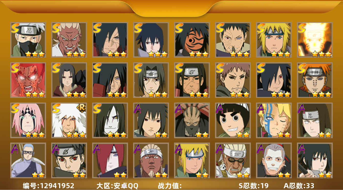 [12941952]19S级忍者数-33A级忍者数 【S级忍者】:千手柱间「秽土转生」(3星千手柱间「秽土转生」),宇智波鼬「秽土转生」(3星宇智波鼬「秽土转生」),宇智波斑「秽土转生」(3星宇智波斑「秽土转生」),宇智波斑「秽土转生·解」(3星宇智波斑「秽土转生·解」),春野樱「忍界大战」(3星春野樱「忍界大战」),宇智波带土「忍界大战」(3星宇智波带土「忍界大战」),艾「忍界大战」(3星艾「忍界大战」),宇智波鼬「须佐能乎」(3星宇智波鼬「须佐能乎」),旗木卡卡西「须佐能乎」(3星旗木卡卡西「须佐能乎」),宇智波斑「木叶创立」(3星宇智波斑「木叶创立」),罗砂「四代目风影」(3星罗砂「四代目风影」),自来也「舞之豪杰」(3星自来也「舞之豪杰」),大蛇丸(3星大蛇丸),波风水门(3星波风水门),神秘面具男「红夜之刃」(3星神秘面具男「红夜之刃」),漩涡鸣人「九喇嘛连结」(3星漩涡鸣人「九喇嘛连结」),迈特凯「死门」(3星迈特凯「死门」),佩恩「天道」(3星佩恩「天道」),宇智波佐助「永恒万花筒」(3星宇智波佐助「永恒万花筒」) 【A级忍者】:艾「青年」(2星艾「青年」),长门「青年」(2星长门「青年」),波风水门「青年」(2星波风水门「青年」),达鲁伊「博人传」(2星达鲁伊「博人传」),迪达拉(2星迪达拉),迪达拉「秽土转生」(2星迪达拉「秽土转生」),奇拉比(2星奇拉比),奇拉比「忍界大战」(2星奇拉比「忍界大战」),飞段(2星飞段),飞段「死司凭血」(2星飞段「死司凭血」),飞段「恶灵之影」(2星飞段「恶灵之影」),干柿鬼鲛(2星干柿鬼鲛),漩涡博人「桃式显现」(2星漩涡博人「桃式显现」),漩涡鸣人「仙人模式」(2星漩涡鸣人「仙人模式」),漩涡鸣人「九尾查克拉」(2星漩涡鸣人「九尾查克拉」),迈特凯(2星迈特凯),旗木卡卡西「万花筒写轮眼」(2星旗木卡卡西「万花筒写轮眼」),我爱罗「疾风传」(2星我爱罗「疾风传」),蝎(2星蝎),蝎「绯流琥」(2星蝎「绯流琥」),猿飞阿斯玛(2星猿飞阿斯玛),宇智波止水(2星宇智波止水),宇智波鼬(2星宇智波鼬),宇智波佐助「须佐能乎」(2星宇智波佐助「须佐能乎」),宇智波佐助「万花筒写轮眼」(2星宇智波佐助「万花筒写轮眼」),照美冥「五代目水影」(2星照美冥「五代目水影」),日向宁次「忍界大战」(2星日向宁次「忍界大战」),长十郎「六代目水影