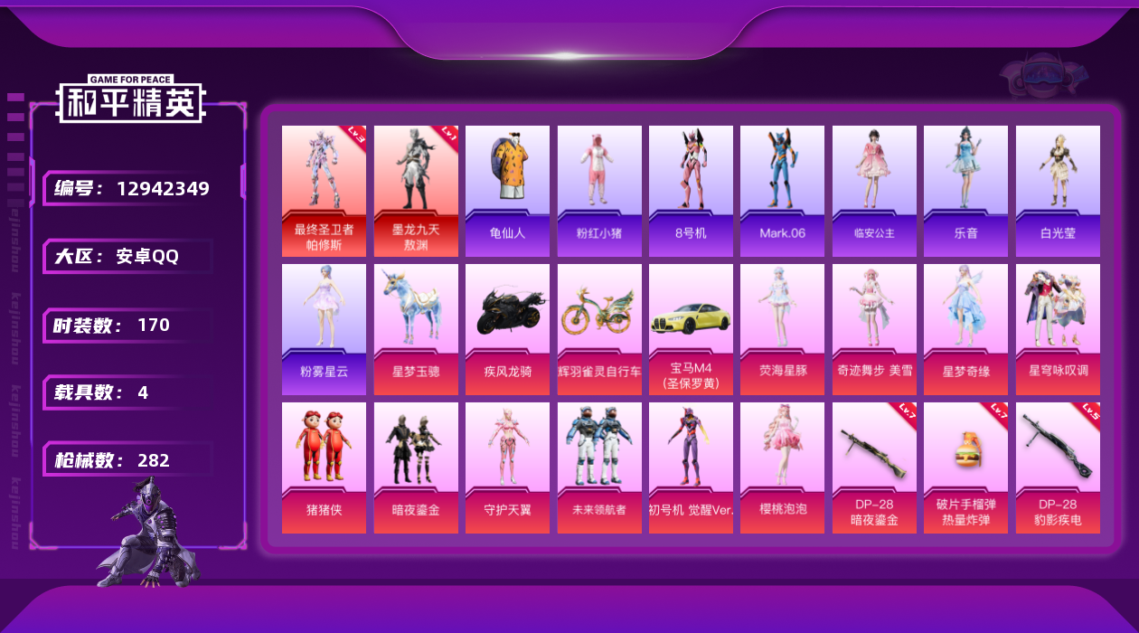 [12942349]MQ878--安卓 手Q-2神装最终圣卫者-帕修斯(三级),墨龙九天-敖渊(一级)-12粉装-16特效枪-4载具-15粉色飞行器-106421热力值-14王牌印记-170套装-282枪皮
