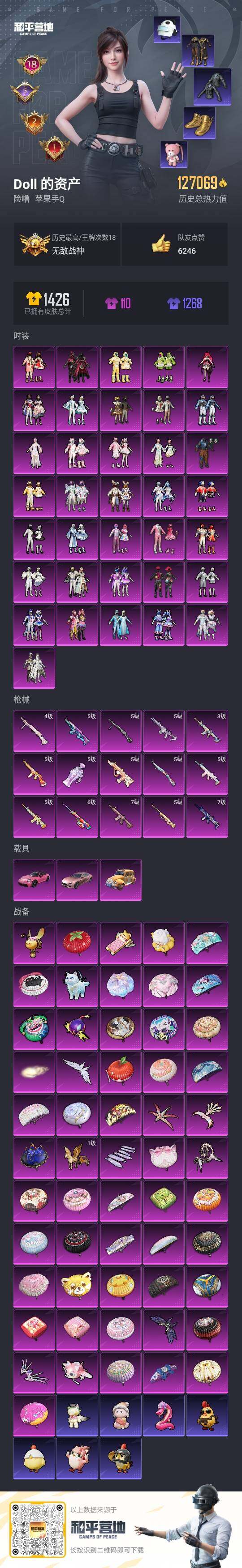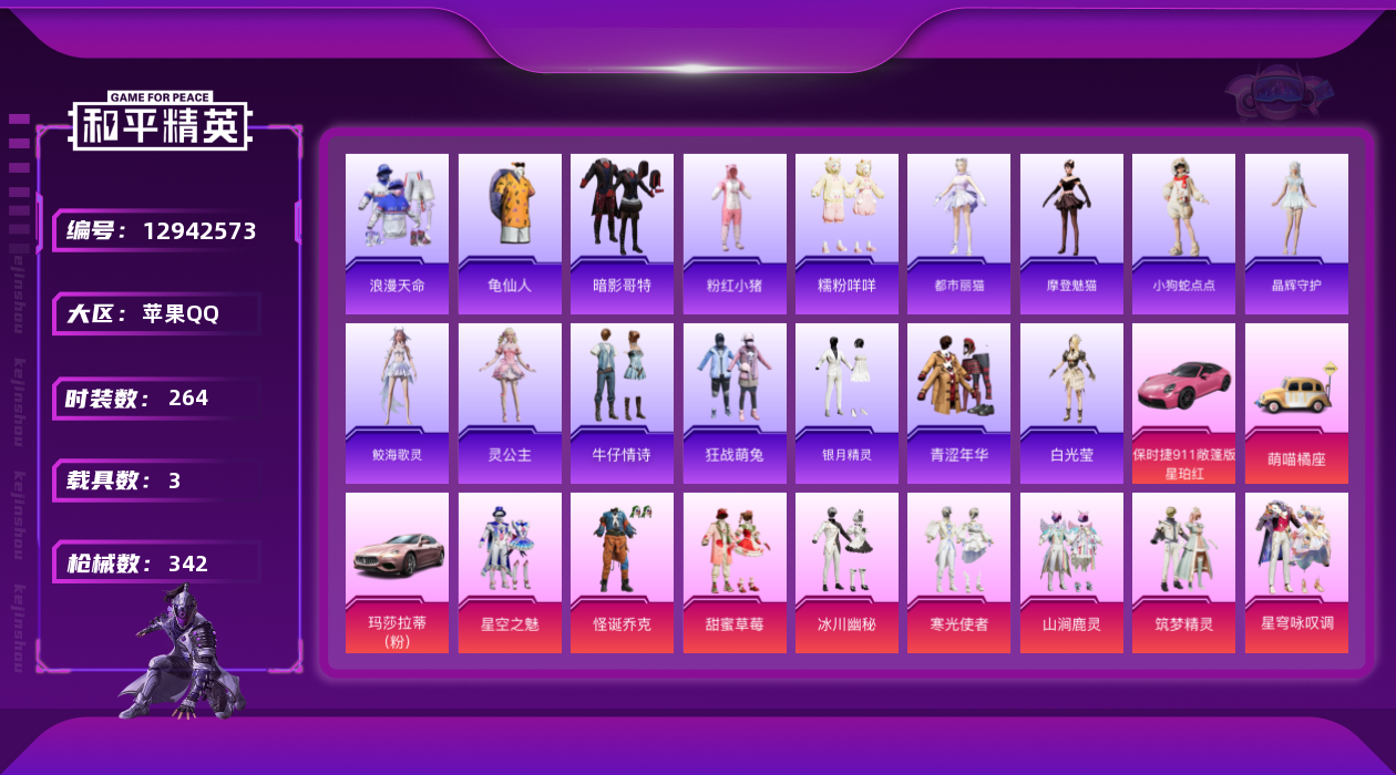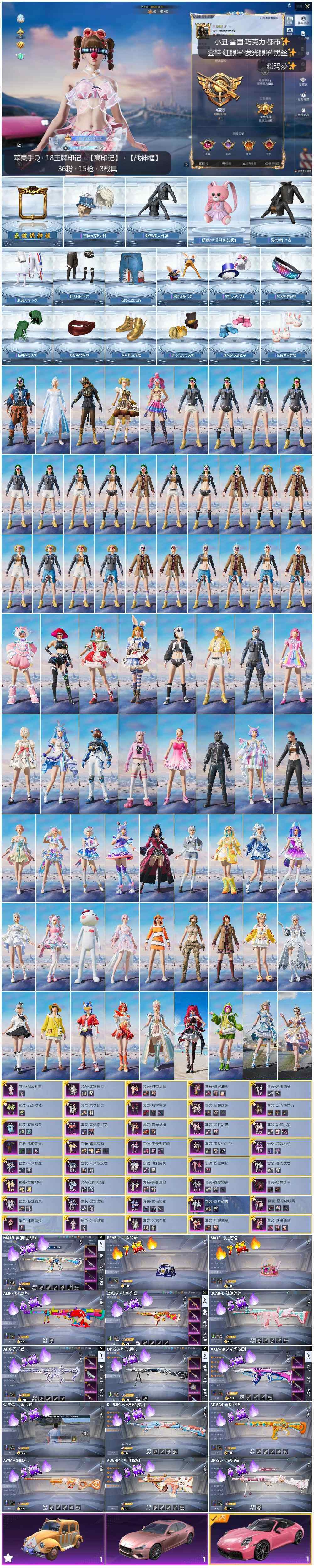 - [12916038]苹果 手Q-5粉装-4特效枪-1载具-1粉色飞行器-49673热力值-10王牌印记-109套装-166枪皮 【热门品类】:角色-军刀雅典娜,套装-龟仙人 【粉色载具】:玛莎拉蒂Quattroporte(夜幕蓝) 【粉色套装】:粉装-焦糖拿铁,角色-复仇流浪者,粉装-彩虹甜喵,角色-烟云彩露,粉装-幻彩电音 【粉色枪皮等级】:M416-电玩时刻(五级),GROZA-焦糖拿铁(七级),Kar98K-巳巳如意(五级),DP-28-豹影疾电(一级) 【粉色枪皮】:M416-电玩时刻,GROZA-焦糖拿铁,Kar98K-巳巳如意,DP-28-豹影疾电 【粉色飞行器】:镜光幻境飞行翼 【粉色降落伞】:梦幻火箭降落伞,焦糖拿铁降落伞,环太平洋降落伞,垂柳戏鸭降落伞,旋转彩虹降落伞,未来歌姬降落伞,炫光之旅降落伞,江南烟雨降落伞,精灵梦叶罗丽降落伞 【稀有套装】:套装-龟仙人,套装-糖糖葫芦,套装-青团波波,套装-棉花软糖,角色-摩登魅猫,套装-燕燕于飞,套装-鱼渊荷华,角色-糖霜甜心,套装-星影赞美诗 【稀有枪皮】:AKM-夜灯,AKM-彩虹符号,AKM-破晓战魂,AKM-龙的传人,M16A4-幻世战舞者,M16A4-甜心亚梦,M16A4-红色方程式,M16A4-蓝色火焰,SCAR-L-夜灯,SCAR-L-玉兔迎春,SCAR-L-红色方程式,M416-糯团青竹,M416-红色方程式,M416-蓝色火焰,GROZA-懵萌河马,GROZA-治愈之星,GROZA-田园牧歌,AUG-耀粉歌者,QBZ-未来歌姬,QBZ-赛罗,M762-天降萌叽,M762-彩虹符号,M762-第五大道,Mk47-妙红点点,Mk47-炫光之旅,G36C-懵萌河马,G36C-星穹咏叹调,AC-VAL-彩虹甜喵,AC-VAL-快闪甜心,AC-VAL-甜心亚梦,蜜獾-天降萌叽,蜜獾-娇憨猪猪,UZI-啾咪啾咪,UZI-天降萌叽,UZI-娇憨猪猪,UMP45-涂山之恋,UMP45-蓝色火焰,Vector-焰鹰斗篷,Vector-田园牧歌,汤姆逊-天降萌叽,汤姆逊-环太平洋,P90-倾城蜜语,P90-快闪甜心,Kar98K-彩虹符号,Kar98K-炫彩节奏,Kar98K-红色方程式,AWM-焰鹰斗篷,AWM-圣堂之誓,SKS-炫彩节奏,SKS-焦糖拿铁,VSS-彩虹符号,VSS-田园牧歌,Mini14-旋转彩虹,Mi