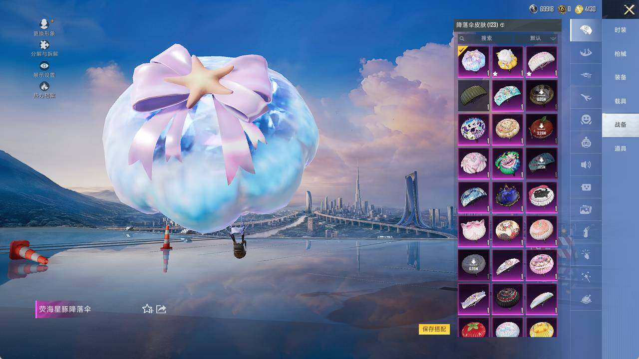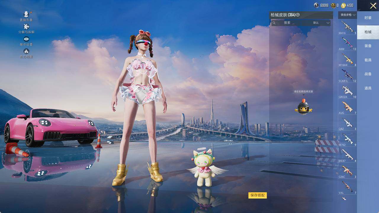 AKM-梦之光华,M16A4-垂柳戏鸭,SCAR-L-青春物语,M416-心之恋语,AUG-暖羊咩咩,Kar98K-巳巳如意,AWM-橘柚倾心,AMR-炫光之旅,DP-28-千金淑猫,烟雾弹-丁香清露