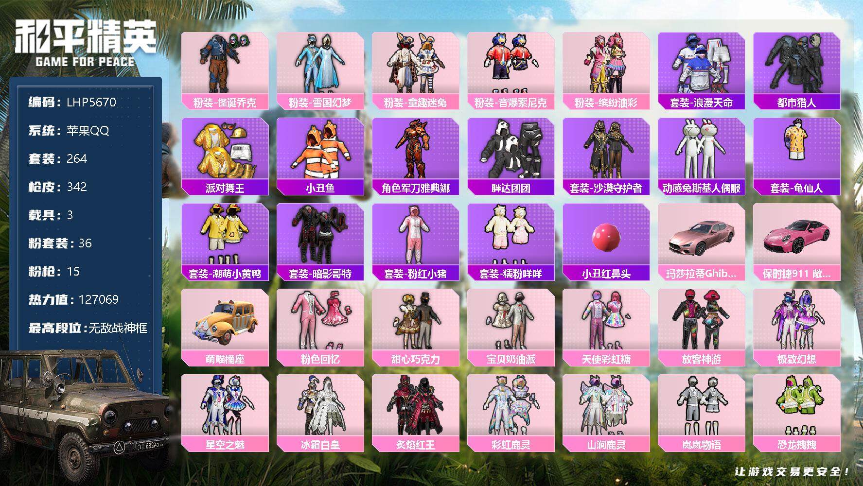 [12942573]素材身法号/无敌战神框1/绝世印记1 苹果 手Q-无敌战神框-36粉装-15特效枪-3载具-14粉色飞行器-12.7w热力值-18王牌印记-264套装-342枪皮【热门品类】:粉装-怪诞乔克,粉装-雪国幻梦,粉装-童趣迷兔,粉装-音爆索尼克,粉装-缤纷油彩,套装-浪漫天命,套装-都市猎人,套装-派对舞王,套装-小丑鱼,角色-军刀雅典娜,套装-胖达团团,套装-沙漠守护者,套装-动感兔斯基人偶服,套装-龟仙人,套装-潮萌小黄鸭,套装-暗影哥特,套装-粉红小猪,套装-糯粉咩咩,小丑红鼻头【粉色载具】:玛莎拉蒂Ghibli(粉),保时捷911 敞篷版(星珀红),萌喵橘座【粉色套装】:粉装-粉色回忆,粉装-怪诞乔克,粉装-甜心巧克力,粉装-宝贝奶油派,粉装-天使彩虹糖,粉装-雪国幻梦,粉装-缤纷油彩,粉装-放客神游,粉装-极致幻想,粉装-星空之魅,粉装-冰霜白皇,粉装-童趣迷兔,粉装-炙焰红王,粉装-彩虹鹿灵,粉装-山涧鹿灵,粉装-岚岚物语,粉装-恐龙拽拽,粉装-绚丽摇曳,粉装-筑梦精灵,粉装-甜梦小狐,粉装-暖熊萌萌,粉装-傲雪凌霜,粉装-垂柳戏鸭,粉装-彩虹甜喵,粉装-甜蜜草莓,粉装-冰川幽秘,粉装-霞光圣骑,粉装-寒光使者,粉装-音爆索尼克,粉装-未来歌姬,粉装-莲影清波,角色-烟云彩露,粉装-未来领航者,粉装-雪月幻音,粉装-星穹咏叹调,角色-绯穹魔姬【粉色枪皮等级】:AKM-梦之光华(五级),M16A4-垂柳戏鸭(五级),SCAR-L-青春物语(七级),SCAR-L-锦绣绵绵(五级),M416-心之恋语(七级),M416-灵猫魔法师(三级),AUG-暖羊咩咩(五级),ARX-无垠阁(五级),汤姆逊-热量炸弹(五级),Kar98K-巳巳如意(五级),AWM-橘柚倾心(五级),AMR-炫光之旅(六级),DP-28-千金淑猫(四级),DP-28-豹影疾电(五级),烟雾弹-丁香清露(五级)【粉色飞行器】:梦之光华飞行器,齐天大圣飞行器,甜梦小狐飞行器,星夜魔法师飞行翼,暖熊萌萌飞行器,镜光幻境飞行翼,沙丘之主天马,镜域双华-灵镜之阶,凤舞九天飞行器,双重狂想飞行器,灵猫魔法师飞行器