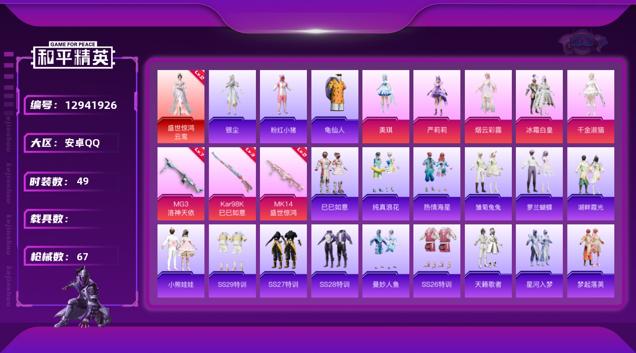 [12941926]【暑期末清货/特价急出/永久包赔/商品详情看图】:安卓 手Q-1红装-5粉装-3特效枪-2.6w热力值-5印记-49套装-67枪皮【角色神装等级】:盛世惊鸿-云鸾(二级盛世惊鸿-云鸾)【特效枪等级】:Kar98K-巳巳如意(三级Kar98K-巳巳如意),Mk14-盛世惊鸿(二级Mk14-盛世惊鸿),MG3-洛神天依(七级MG3-洛神天依)【优质套装】:粉装-冰霜白皇,角色-烟云彩露,角色-严莉莉,角色-美琪,角色-千金淑猫【稀有套装】:套装-巳巳如意【优质武器皮肤】:Kar98K-巳巳如意,Mk14-盛世惊鸿,MG3-洛神天依【优质飞行器】:酣梦熊熊飞行器,镜域双华-灵镜之阶,深渊漩涡飞行器,凤舞九天飞行器,万象金身飞行器