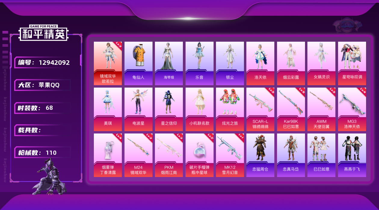 [12942092]MQ845-苹果 镜域双华-欧若拉(三级)手Q-1神装-9粉装-9特效枪-0载具-4粉色飞行器-41776热力值-3王牌印记-68套装-110枪皮
