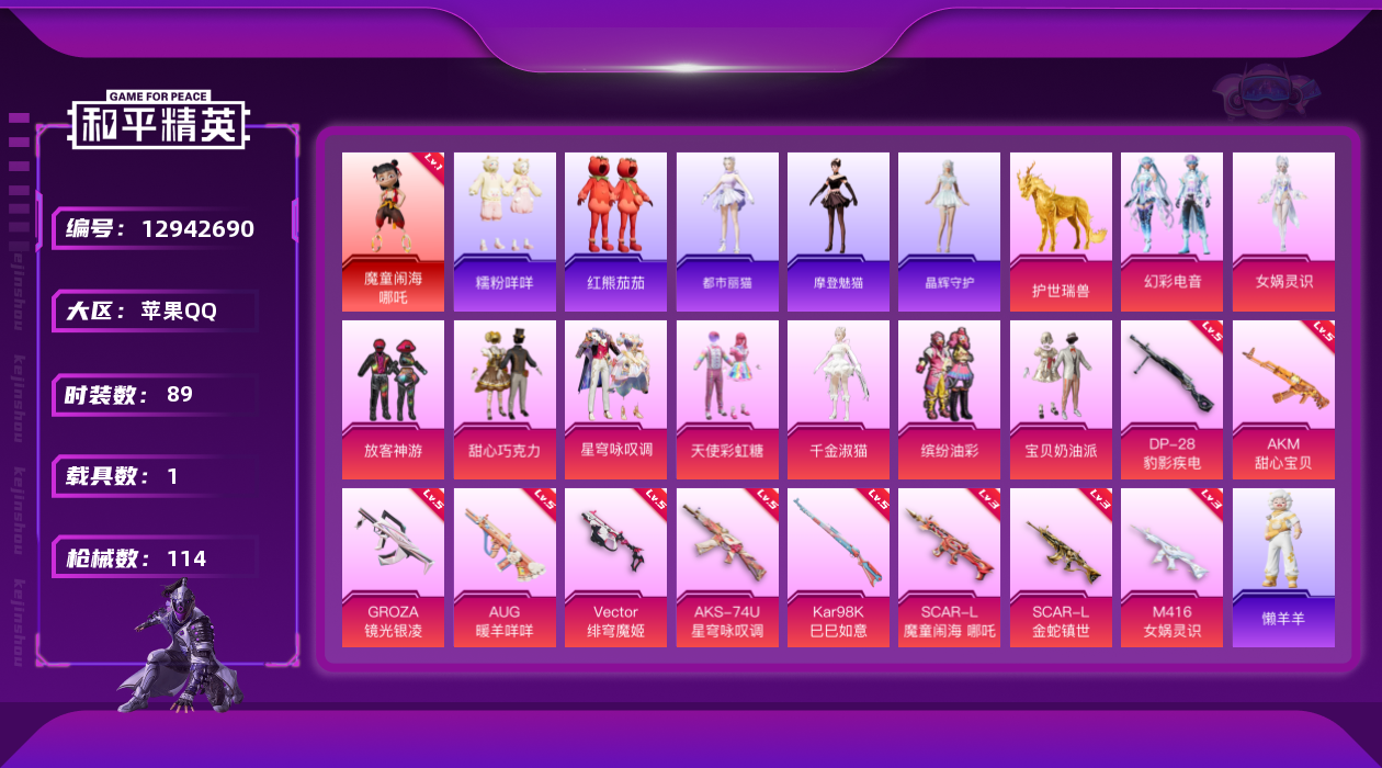 [12942690]身法素材【特价急出/详情看图】:苹果 手Q-1神装-9粉装-10特效枪-1载具-5粉色飞行器-45639热力值-5王牌印记-89套装-114枪皮