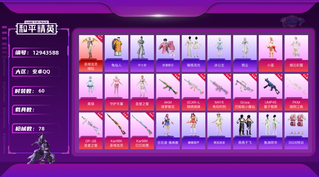 [12943588]安卓 手Q-1神装-5粉装-9特效枪-0载具-1粉色飞行器-30749热力值-2王牌印记-60套装-78枪皮 【红色神装等级】:圣域龙灵-瑞拉(一级) 【红色角色神装】:圣域龙灵-瑞拉 【热门品类】:套装-龟仙人 【粉色载具】:僚机-圣域龙宝 【粉色套装】:角色-圣堂之誓,角色-烟云彩露,角色-小蓝,角色-美琪,角色-守护天翼 【粉色枪皮等级】:AKM-绿萝繁花(五级),SCAR-L-锦绣绵绵(五级),M416-电玩时刻(五级),GROZA-巴啦啦小魔仙(五级),UMP45-量子极限(五级),Kar98K-巳巳如意(一级),Kar98K-圣域龙灵(三级),DP-28-圣堂之誓(四级),PKM-江南烟雨(五级) 【粉色枪皮】:AKM-绿萝繁花,SCAR-L-锦绣绵绵,M416-电玩时刻,GROZA-巴啦啦小魔仙,UMP45-量子极限,Kar98K-巳巳如意,Kar98K-圣域龙灵,DP-28-圣堂之誓,PKM-江南烟雨 【粉色飞行器】:圣域金龙飞行器 【粉色降落伞】:圣堂之誓降落伞,猪猪侠降落伞,蜜语绒猫降落伞,江南烟雨降落伞,精灵梦叶罗丽降落伞,守护天翼降落伞,圣域龙灵降落伞 【稀有套装】:套装-龟仙人,角色-狂花道·雅典娜,套装-糖糖葫芦,套装-青团波波,角色-许七安,套装-燕燕于飞,套装-鱼渊荷华 【稀有枪皮】:AKM-江南烟雨,AC-VAL-快闪甜心,蜜獾-天降萌叽,UZI-啾咪啾咪,UMP45-猪猪侠,Vector-焰鹰斗篷,Vector-生命誓言,P90-快闪甜心,Kar98K-彩虹符号,AWM-焰鹰斗篷,AWM-圣堂之誓,SKS-圣域龙灵,M417-猪猪侠,MK20-H-快闪甜心,MK20-H-圣域龙灵,S12K-玩趣呆呆,S12K-智耀战神,DBS-焰鹰斗篷,DBS-圣堂之誓,DP-28-焰鹰斗篷,短管霰弹-圣域龙灵,沙漠之鹰-快闪甜心,TMP-9-江南烟雨,战术弩-江南烟雨,大砍刀-黑金刀 【其他套装】:套装-SS26特训,套装-SS27特训,套装-SS28特训,套装-SS29特训,套装-双彩绵绵,套装-吉莉礼服,套装-浪漫假日,套装-湖蓝色名流,套装-神秘领域,套装-空岛之星,套装-竞技名士,套装-缤纷果语,套装-长空猛禽,套装-青春校园,套装-龟仙人,套装-快闪甜心,套装-春光漫游,套装-贝斯之夜,套装-无暇誓言,套装-明鸳圣池,玩偶服-菲菲,