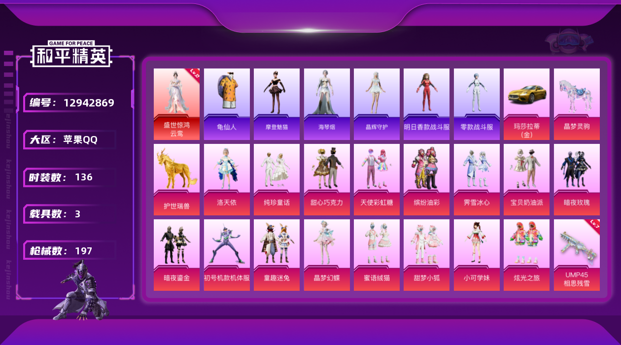 [12942869]身法素材号【特价急出/详情看图】:苹果 手Q-1神装-16粉装-12特效枪-3载具-10粉色飞行器-78995热力值-11王牌印记-136套装-197枪皮