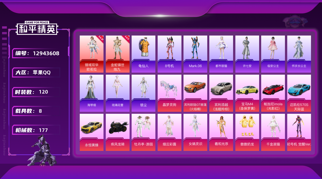 [12943608]金蛇镇世-烛九(一级)!苹果 手Q-2神装-11粉装-11特效枪-8载具-12粉色飞行器-74105热力值-12王牌印记-120套装-177枪皮