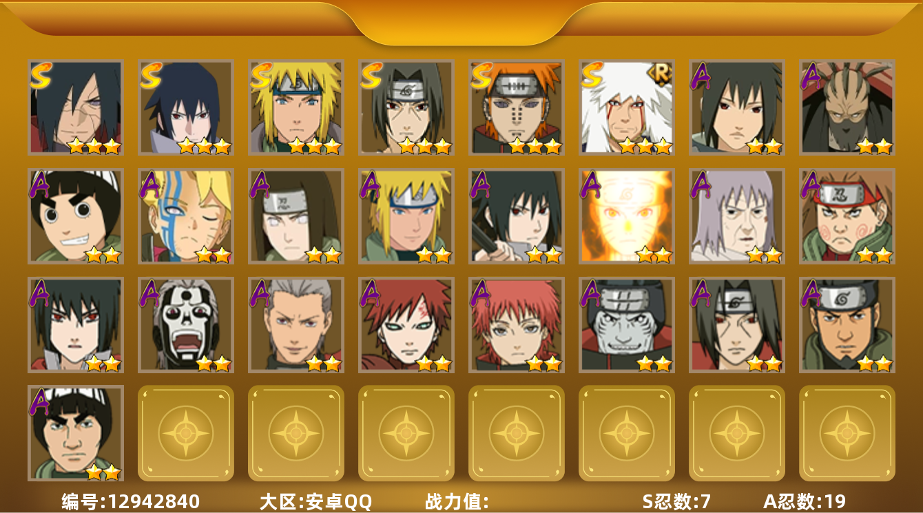 [12942840]7S级忍者数-19A级忍者数 【S级忍者】:宇智波斑「秽土转生·解」(3星),宇智波鼬「须佐能乎」(3星),自来也「舞之豪杰」(3星),自来也「传说中的三忍」(3星),波风水门(4星),佩恩「天道」(3星),宇智波佐助「永恒万花筒」(3星) 【A级忍者】:波风水门「青年」(2星),飞段(2星),飞段「死司凭血」(2星),干柿鬼鲛(3星),漩涡博人「桃式显现」(2星),漩涡鸣人「九尾查克拉」(2星),迈特凯(3星),我爱罗「疾风传」(3星),蝎(2星),蝎「绯流琥」(2星),猿飞阿斯玛(3星),宇智波鼬(2星),宇智波佐助「须佐能乎」(2星),宇智波佐助「万花筒写轮眼」(2星),日向宁次「忍界大战」(2星),李洛克「忍界大战」(2星),秋道丁次「忍界大战」(2星),千代「近松十人卫」(2星),宇智波泉奈(2星)