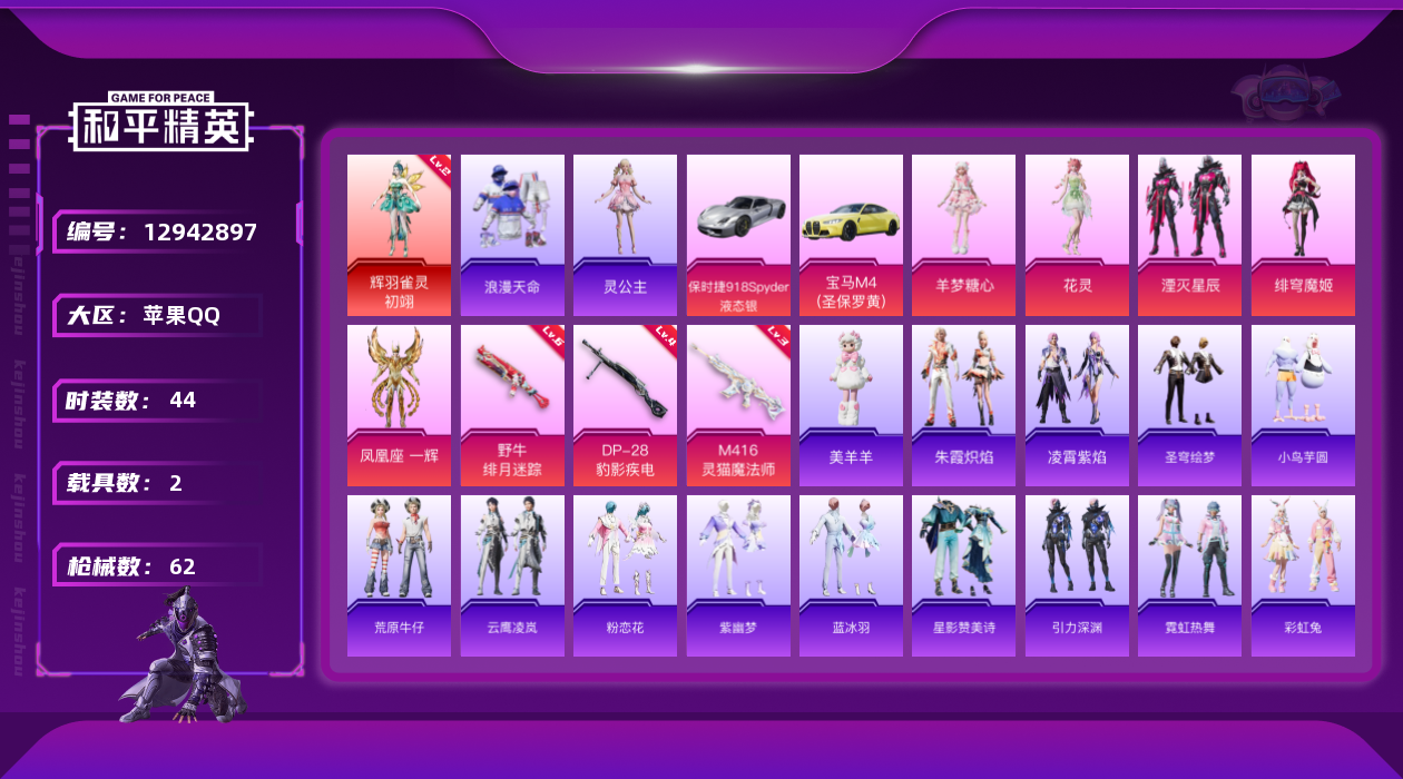 [12942897]身法素材号【特价急出/详情看图】:苹果 手Q-1神装-5粉装-3特效枪-2载具-2粉色飞行器-24421热力值-3王牌印记-44套装-62枪皮