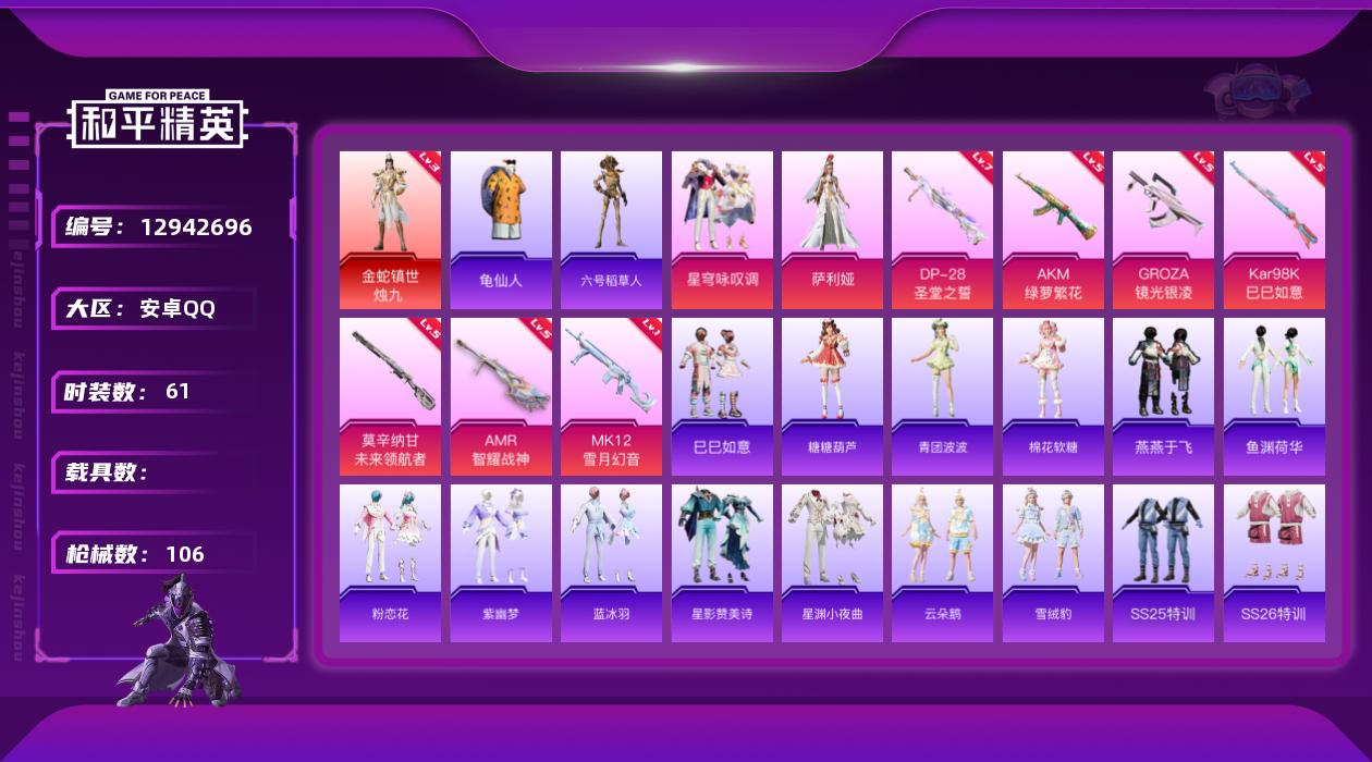 [12942696]地铁满天赋【暑期末清货/特价急出/永久包赔/商品详情看图】:安卓 手Q-1红装-2粉装-7特效枪-3.4w热力值-5印记-61套装-106枪皮【热门品类】:套装-派对舞王【角色神装等级】:金蛇镇世-烛九(三级)【特效枪等级】:AKM-绿萝繁花(五级),GROZA-镜光银凌(五级),Kar98K-巳巳如意(五级),莫辛纳甘-未来领航者(五级),AMR-智耀战神(五级),MK12-雪月幻音(一级),DP-28-圣堂之誓(七级)【优质套装】:角色-萨利娅,粉装-星穹咏叹调【稀有套装】:套装-龟仙人,套装-巳巳如意,套装-糖糖葫芦,套装-青团波波,套装-棉花软糖,套装-燕燕于飞,套装-鱼渊荷华,套装-粉恋花,套装-紫幽梦,套装-蓝冰羽,角色-六号稻草人,套装-星影赞美诗,套装-星渊小夜曲,套装-云朵鹅,套装-雪绒豹【优质武器皮肤】:AKM-绿萝繁花,GROZA-镜光银凌,Kar98K-巳巳如意,莫辛纳甘-未来领航者,AMR-智耀战神,MK12-雪月幻音,DP-28-圣堂之誓