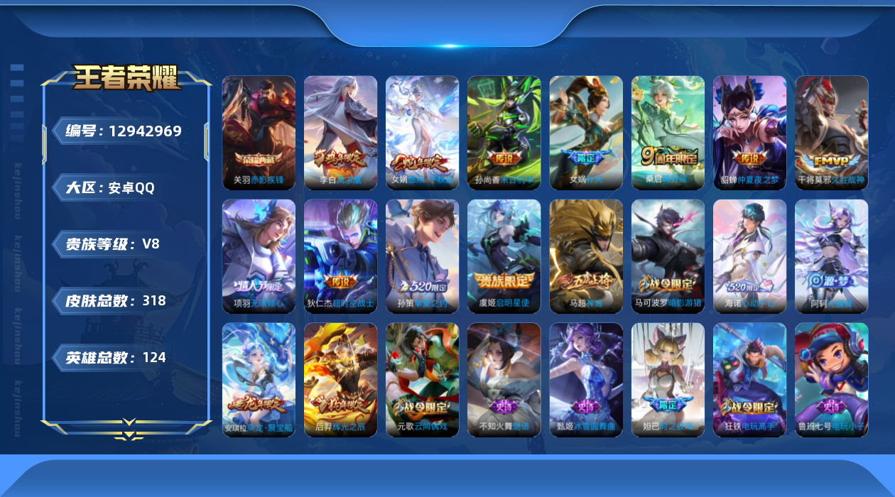 [12942969]安卓Q-V8-永恒钻石I段位-124英雄-318皮肤-1典藏-0珍品无双-0无双-0珍品传说-11传说-94史诗