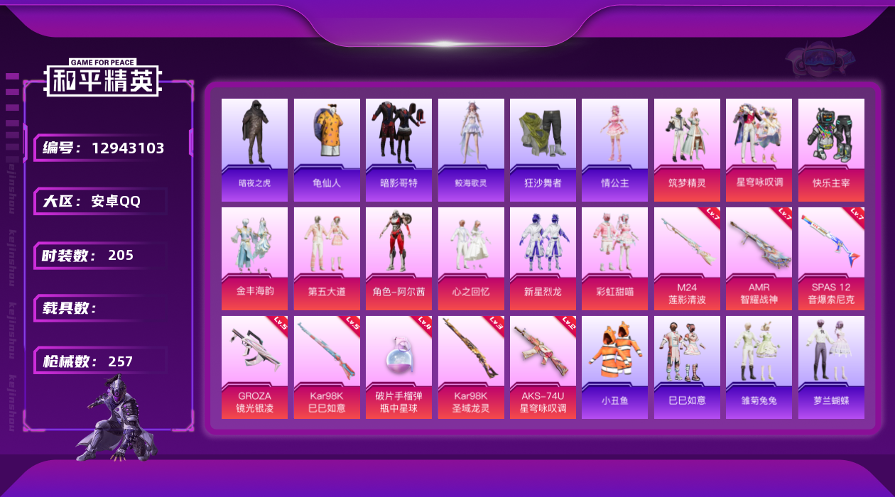 [12943103]身法素材号【特价急出/详情看图】:安卓 手Q-9粉装-8特效枪-0载具-3粉色飞行器-86025热力值-16王牌印记-205套装-257枪皮