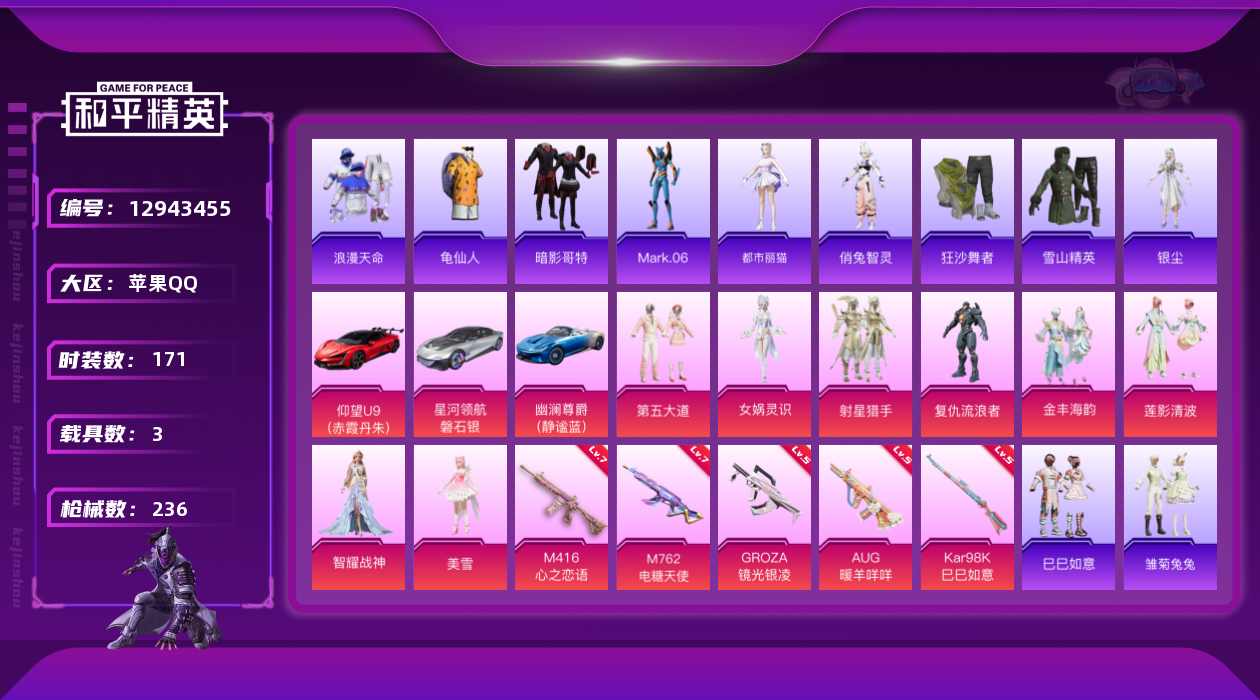 [12943455]苹果 手Q-9粉装-5特效枪-3载具-3粉色飞行器-78107热力值-13王牌印记-171套装-236枪皮