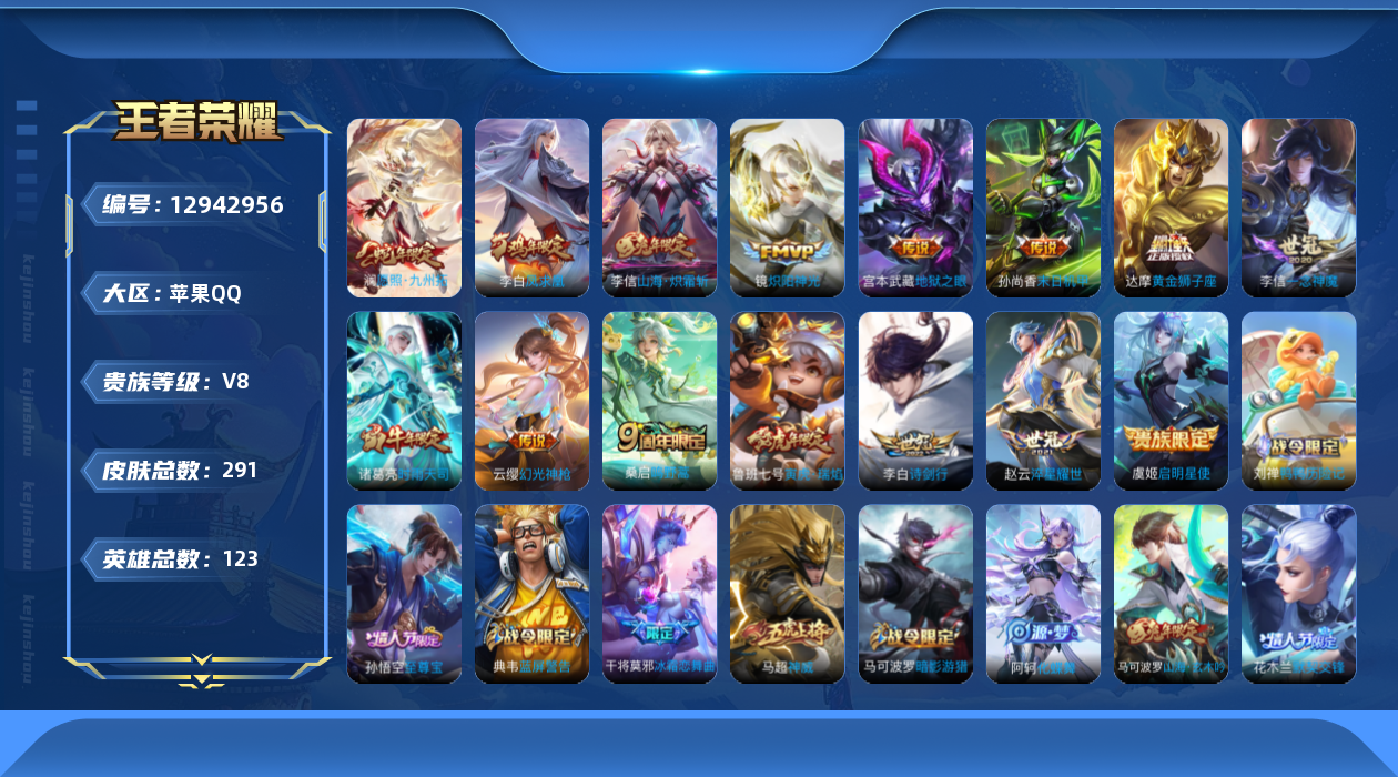 [12942956]【暑期末清货/特价急出/永久包赔】:苹果Q-V8-永恒钻石IV段位-123英雄-291皮肤-15传说-90史诗