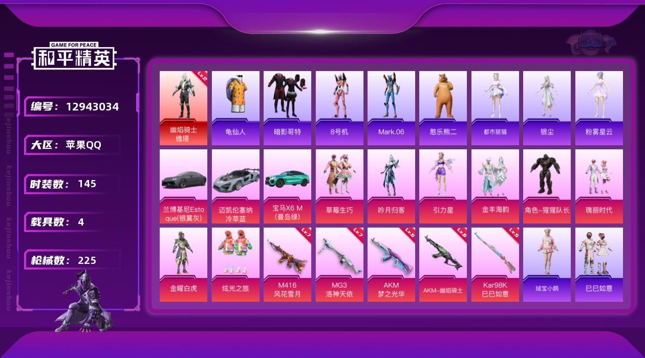 [12943034]苹果 手Q-1神装-9粉装-5特效枪-4载具-6粉色飞行器-83371热力值-16王牌印记-145套装-225枪皮 【红色神装等级】:幽焰骑士-维塔(二级) 【红色角色神装】:幽焰骑士-维塔 【热门品类】:粉装-梦幻火箭,套装-龟仙人,套装-暗影哥特,角色-8号机,角色-Mark.06 【粉色载具】:兰博基尼Estoque(银翼灰),宝马X6 M(曼岛绿),迈凯伦塞纳(冷萃蓝) 【粉色套装】:粉装-金曜白虎,粉装-梦幻火箭,粉装-草莓生巧,粉装-吟月归客,粉装-瑰丽时代,角色-猩猩队长,粉装-炫光之旅,角色-引力星,粉装-金丰海韵 【粉色枪皮等级】:AKM-梦之光华(六级),AKM-幽焰骑士(六级),M416-风花雪月(七级),Kar98K-巳巳如意(五级),MG3-洛神天依(七级) 【粉色枪皮】:AKM-梦之光华,AKM-幽焰骑士,M416-风花雪月,Kar98K-巳巳如意,MG3-洛神天依 【粉色飞行器】:酣梦熊熊飞行器,翩跹演武飞行器,超新星飞行器,幽焰列车飞行器,凤舞九天飞行器 【粉色降落伞】:梦幻火箭降落伞,阿狸红降落伞,暗夜玫瑰降落伞,风花雪月降落伞,筑梦精灵降落伞,彩虹甜喵降落伞,音爆索尼克降落伞,天星战神降落伞,未来歌姬降落伞,萌物绒绒降落伞,江南烟雨降落伞,墨龙九天降落伞,未来领航者降落伞,幽焰骑士降落伞,月影灵韵降落伞 【稀有套装】:套装-龟仙人,玩偶服-憨乐熊二,套装-绒宝小鹅,套装-巳巳如意,套装-雏菊兔兔,套装-萝兰蝴蝶,套装-糖糖葫芦,套装-青团波波,套装-棉花软糖,角色-都市丽猫,套装-黑曜寓言,套装-燕燕于飞,套装-鱼渊荷华,套装-紫幽梦,套装-蓝冰羽 【稀有枪皮】:AKM-2P战斗服款,AKM-彩虹符号,AKM-星之信仰,AKM-灼热熔岩,AKM-筑梦精灵,AKM-虎虎生威,AKM-阿狸红,AKM-霓虹街区,AKM-龙的传人,M16A4-幻世战舞者,M16A4-甜心亚梦,M16A4-莲影清波,M16A4-魔法学院,SCAR-L-炫彩节奏,SCAR-L-玉兔迎春,SCAR-L-甜蜜誓约,M416-糯团青竹,M416-红色方程式,M416-蓝色火焰,GROZA-2B战斗服款,GROZA-异彩先驱,GROZA-懵萌河马,GROZA-田园牧歌,AUG-耀粉歌者,QBZ-电玩视界,QBZ-神秘黑猫,QBZ-飞驰魅影,M762-瑞龙福将,M7