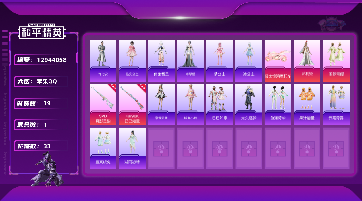 [12944058]【暑期末清货/特价急出/永久包赔】:苹果 手Q-2粉装-2特效枪-1载具-1.1w热力值-0印记-19套装-33枪皮【稀有载具】:盛世惊鸿摩托车【特效枪等级】:Kar98K-巳巳如意(三级),SVD-月影灵韵(四级)【优质套装】:粉装-闲梦青缨,角色-萨利娅【优质飞行器】:酣梦熊熊飞行器,凤舞九天飞行器