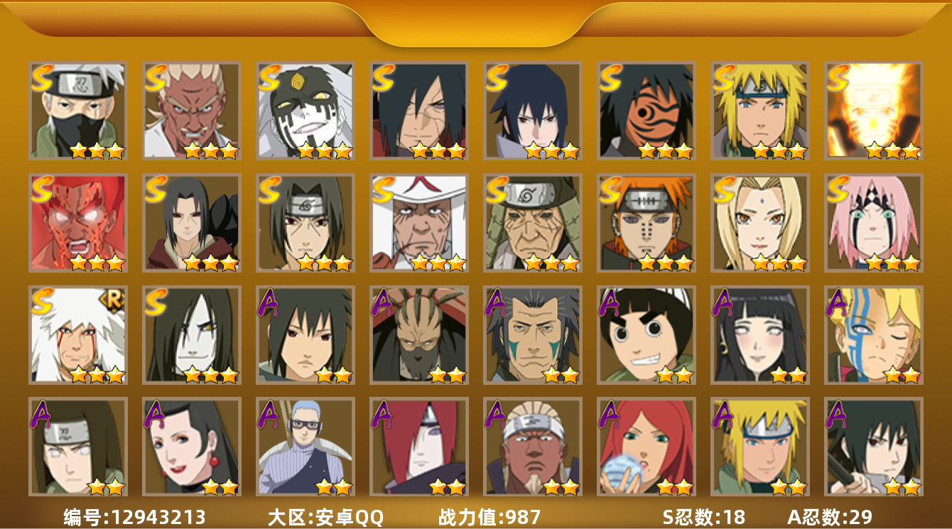 [12943213]V9/战力987W/S忍18/A忍29 3星大筒木桃式,3星宇智波佐助「永恒万花筒」,3星宇智波斑「秽土转生·解」,3星神秘面具男「红夜之刃」,3星波风水门,3星漩涡鸣人「九喇嘛连结」,3星迈特凯「死门」,3星宇智波鼬「秽土转生」,3星宇智波鼬「须佐能乎」,3星猿飞日斩,3星猿飞日斩「秽土转生」,3星佩恩「天道」,3星纲手,3星春野樱「忍界大战」,3星自来也「舞之豪杰」,3星大蛇丸,3星艾「忍界大战」,3星旗木卡卡西「须佐能乎」,3星我爱罗「疾风传」,2星迪达拉,4星蝎,5星迈特凯,5星猿飞阿斯玛,5星干柿鬼鲛,2星飞段,2星飞段「死司凭血」,2星日向宁次「忍界大战」,2星不缘,2星长十郎「六代目水影」,2星不风,2星宇智波鼬,2星长门「青年」,2星艾「青年」,2星波风水门「青年」,2星奇拉比,2星宇智波佐助「须佐能乎」,2星秋道丁次「忍界大战」,2星千代「近松十人卫」,2星漩涡博人「桃式显现」,2星日向雏田「最终章」,2星李洛克「忍界大战」,2星宇智波泉奈,2星蝎「绯流琥」,2星不动