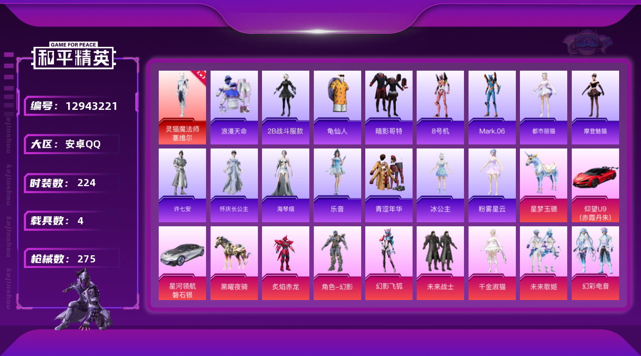 - [12191202]素材身法号【特价急出/详情看图】:安卓 手Q-14粉装-3特效枪-4载具-7粉色飞行器-6.2w热力值-11王牌印记-145套装-174枪皮【热门品类】:粉装-梦幻火箭,角色-2P战斗服款,套装-龟仙人,套装-粉红小猪【粉色载具】:玛莎拉蒂Quattroporte(夜幕蓝),迈凯伦570S(旭日黄),Formula E Gen2(幽光蓝),星梦玉骢【粉色套装】:粉装-梦幻火箭,粉装-冰霜白皇,粉装-蜜桃特工,粉装-山涧鹿灵,粉装-赤焰黑爵,粉装-紫电风暴,粉装-暗夜鎏金,粉装-第五大道,角色-呆萌星弥,角色-小可学妹,角色-烟云彩露,角色-小蓝,角色-美琪,角色-月影灵韵【粉色枪皮等级】:GROZA-旋转彩虹(七级),Kar98K-巳巳如意(五级),DP-28-豹影疾电(五级)【粉色飞行器】:童趣迷兔飞行器,相思残雪飞行器,冷魅冰骑飞行器,沙丘之主天马,镜域双华-灵镜之阶,深渊漩涡飞行器