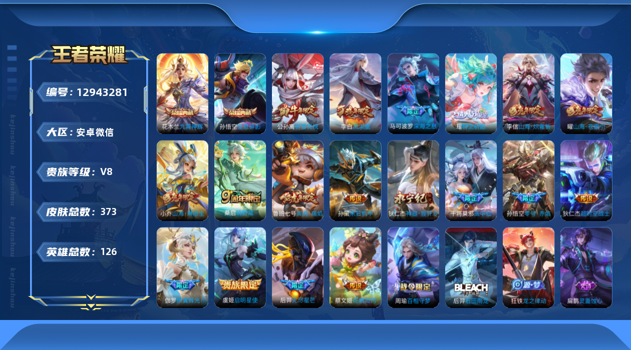 [12943281]AK608 安卓WX-V8-最强王者段位-125英雄-372皮肤-2典藏-0珍品无双-0无双-0珍品传说-18传说-108史诗