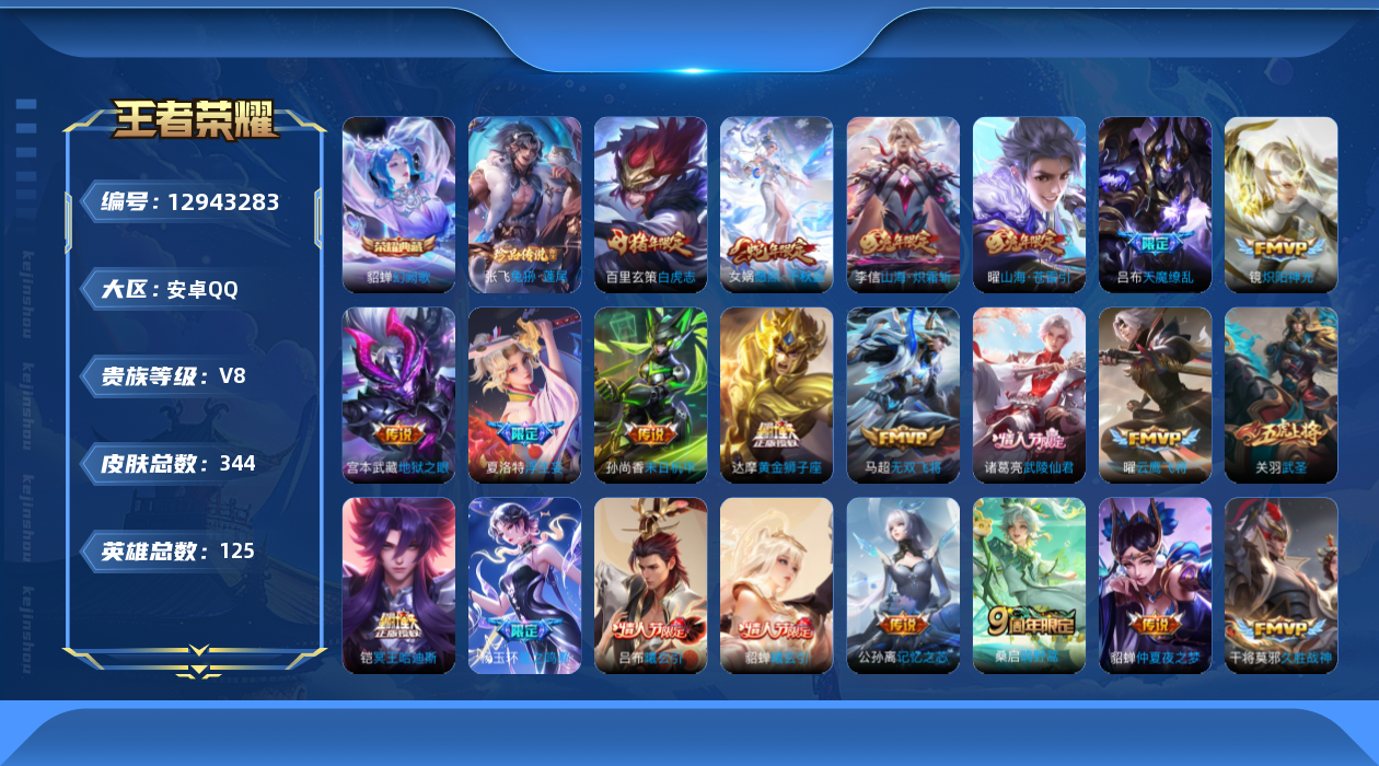 [12943283]【暑期末清货/特价急出/永久包赔】:安卓Q-V8-永恒钻石I段位-125英雄-344皮肤-1典藏-1珍品传说-31传说-95史诗