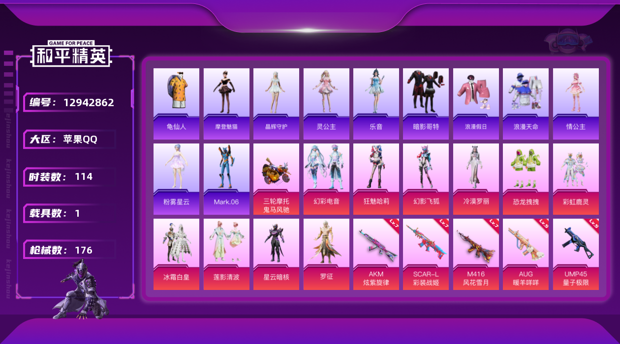 [12942862]【暑期末清货/特价急出/永久包赔/商品详情看图】:苹果 手Q-10粉装-10特效枪-1载具-5.6w热力值-11印记-114套装-176枪皮【热门品类】:套装-小丑鱼【稀有载具】:鬼马风驰【特效枪等级】:AKM-炫紫旋律(七级),SCAR-L-彩装战姬(七级),M416-风花雪月(七级),AUG-暖羊咩咩(五级),UMP45-量子极限(五级),P90-冷漠罗丽(四级),Kar98K-未来歌姬(二级),Kar98K-巳巳如意(五级),DP-28-圣堂之誓(一级),MG3-辉羽雀灵(四级MG-36-幻彩电音)【优质套装】:粉装-冰霜白皇,粉装-彩虹鹿灵,粉装-恐龙拽拽,角色-星云暗核,粉装-莲影清波,粉装-幻影飞狐,粉装-幻彩电音,角色-狂魅哈莉,角色-冷漠罗丽,角色-罗征【优质飞行器】:祥瑞锦鲤飞行器,时光之吻飞行器,绯月迷踪飞行器