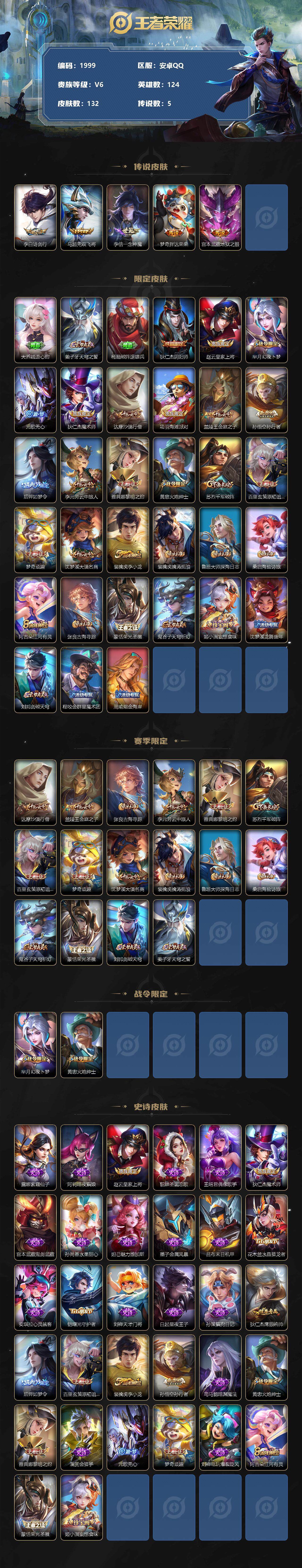 - [12169880]V8 2典藏 1珍品传说 19传说 124英雄 295皮肤 可修改实名 优质装备:全息碎影(猴子典藏),拾光映像(瑶典藏),怪盗基德,黄金狮子座,黄金射手座,冠军飞将,云鹰飞将(小将军),久胜战神,炽阳神光,云霓雀翎,地狱火,仲夏夜之梦(大飞蛾),地狱之眼,李逍遥,淬星耀世,超时空战士-狄仁杰,无双飞将 珍宝阁皮:女武神,玩趣恶龙 限定皮:逐霄战戟,至尊宝,异界灵契(白毛香),神威(电光马子),飞衡(韩信年限),遇见飞天,高山流水,诗剑行,齐天大圣,五谷丰年,冰锋战神,御风骁将(吕布年限),天狼狩猎者,逐梦之星,李小龙,逐梦之影,默契交锋-花木兰,孙行者,青春决赛季,深海之息(深海大菠萝) 史诗皮:化蝶舞,灵蛊蚀心,星界战将,谪仙醉月,琥珀纪元伽罗,百相守梦-百里守约,百相守梦-黄忠,织梦人,遇见神鹿,苍穹之光,白龙吟,黄金分割率,特工魅影,千年之狐,匿光侦查者,鹤归松栖(赵怀真),魅语,蒙恬荣光圣徽,冰冠公主,晚萤,电玩·爆裂旋风,龙骑士(小龙虾),猫狗日记-孙策,猫狗日记-大乔,时之恋人-孙尚香,修罗,女仆咖啡,摇滚巨星,水果甜心,天才门将,星夜王子,心灵骇客,德古拉伯爵,暗隐猎兽者,幽灵船长,鬼剑武藏,暗渊魔法,地狱岩魂,纤云弄巧,繁星吟游(呼啦呼啦),拒霜思,乘风破浪,曙光守护者,热力回旋,箭羽风息,金属风暴,原初追逐者,圣诞狂欢,圣诞恋歌,鹰眼统帅,魅力维加斯,黎明之约,赏金猎手,无心,未来纪元-赵云