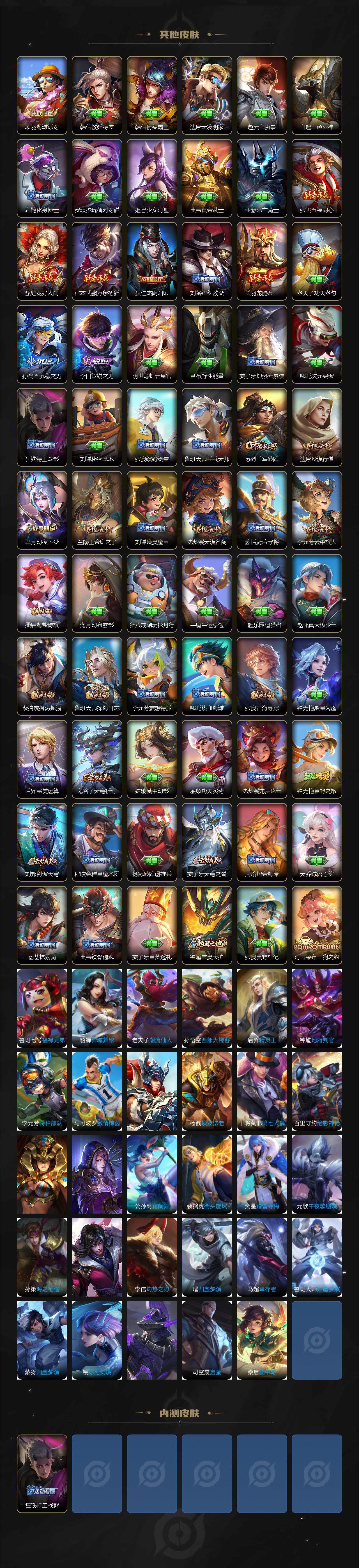 【其他皮肤】:项羽海滩派对,韩信教廷特使,韩信街头霸王,达摩大发明家,赵云白执事,白起白色死神,扁鹊化身博士,安琪拉玩偶对对碰,妲己少女阿狸,典韦黄金武士,亚瑟死亡骑士,张飞五福同心,甄姬花好人间,宫本武藏万象初新,狄仁杰阴阳师,刘备纽约教父,关羽龙腾万里,老夫子功夫老勺,孙尚香沉稳之力,李白敏锐之力,明世隐虹云星官,吕布野性能量,姜子牙炽热元素使,哪吒次元突破,狂铁特工战影,刘禅秘密基地,张良缤纷绘卷,鲁班大师乓乓大师,苏烈千军破阵,达摩沙漠行僧,芈月幻夜卜梦,兰陵王金庭之子,刘
