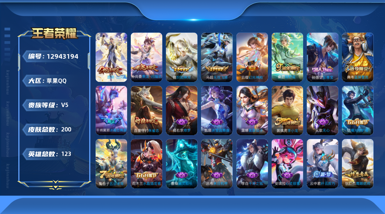 [12943194]【暑期末清货/特价急出/永久包赔】:苹果Q-V5-永恒钻石III段位-123英雄-198皮肤-6传说-55史诗