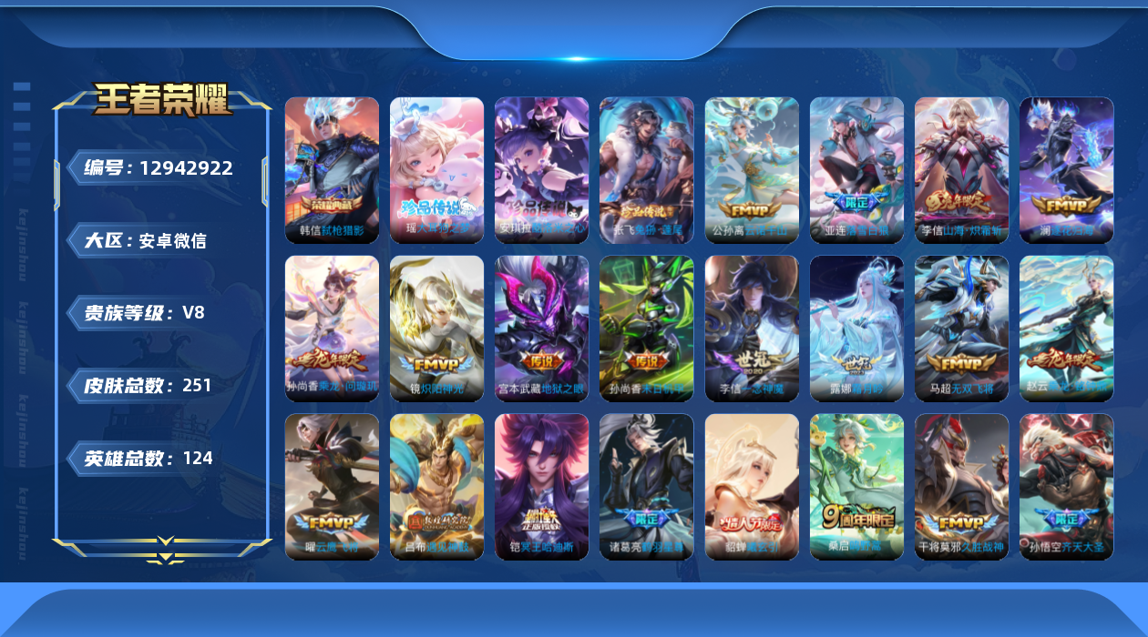 [12942922]安卓WX-V8-最强王者段位-124英雄-251皮肤-1典藏-0珍品无双-0无双-3珍品传说-25传说-78史诗