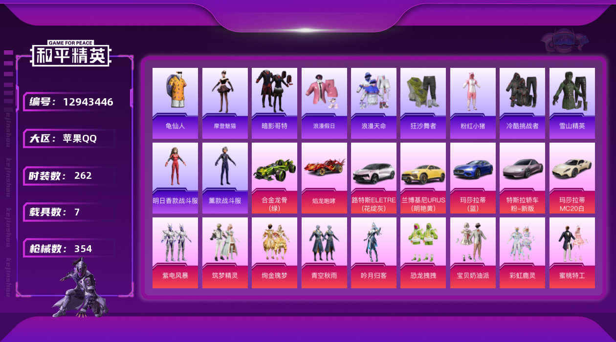 [12943446]老木乃伊【暑期末清货/特价急出/永久包赔】:苹果 手Q-27粉装-13特效枪-7载具-13.3w热力值-16印记-262套装-354枪皮【热门品类】:套装-冥河战士,套装-小丑鱼,套装-奇异狩猎者,角色-军刀雅典娜,套装-胖达团团,套装-金羽特工,套装-都市猎人,套装-动感兔斯基人偶服【稀有载具】:特斯拉Roadster(沁心粉),兰博基尼URUS(明艳黄),路特斯ELETRE(花绽灰),玛莎拉蒂MC20(星石白),玛莎拉蒂Ghibli(蓝),合金龙骨(绿),焰龙咆哮【特效枪等级】:AKM-炫紫旋律(六级),SCAR-L-机甲封神(五级),SCAR-L-青春物语(二级),M416-五爪金龙(五级),M416-至情至圣(九级),GROZA-香水柠檬(七级),M762-激战未来(五级),UMP45-相思残雪(七级),UMP45-恐龙拽拽(一级),Vector-环太平洋(五级),Kar98K-创世·救赎(四级),Kar98K-巳巳如意(三级),M249-蓝莓炮弹(四级)【优质套装】:粉装-极限特训,粉装-宝贝奶油派,粉装-梦幻火箭,粉装-花间之火,粉装-翡翠骑士,粉装-冰霜白皇,粉装-炙焰红王,粉装-香水柠檬,粉装-王牌四分卫,粉装-绿野柔风,粉装-蜜桃特工,粉装-暗夜玫瑰,粉装-彩虹鹿灵,粉装-吟月归客,粉装-蓝莓炮弹,粉装-绚金瑰梦,粉装-焦糖拿铁,粉装-恐龙拽拽,粉装-紫电风暴,粉装-筑梦精灵,粉装-灵感创作师,粉装-碧穹智者,粉装-青空秋雨,粉装-第五大道,粉装-未来歌姬,角色-圣堂之誓,粉装-未来领航者【优质飞行器】:锦绣火鲤飞行器,青春物语飞行器,龙翔九天飞行器