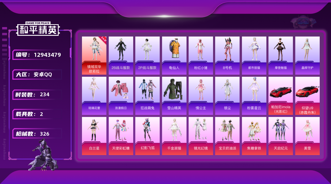 - PX_2089417- 不包人脸 安卓手Q-4王牌印记-2粉装-4特效枪-0载具-33581热力值-82套装-112枪皮-1卓越印记-0传奇印记, 【2粉装】,闲梦青缨,创世·救赎, 【4特效枪】,Kar98K-巳巳如意-5级,M200-伏羲圣卦-7级,Mk14-精灵梦叶罗丽-7级,MK12-雪月幻音-1级, 【3稀有紫装】,龟仙人,怀庆长公主,暗夜魅影, 【82稀有时装】,SS31特训,SS33
