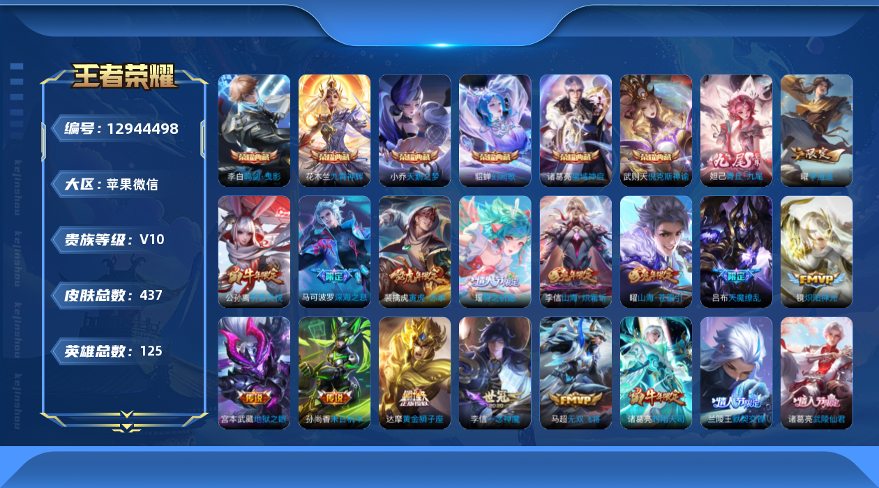 [12944498]苹果WX-V10-最强王者段位-125英雄-437皮肤-6典藏-0珍品无双-1无双-0珍品传说-64传说-151史诗 【荣耀典藏】:武则天英雄,武则天倪克斯神谕,小乔天鹅之梦,李白鸣剑曳影,诸葛亮星域神启,花木兰九霄神辉,貂蝉幻阙歌 【无双皮肤】:妲己青丘九尾 【传说皮肤】:艾琳觅芳踪,王昭君永恒水手月亮,公孙离记忆之芯,干将莫邪画中仙,花木兰燃星之曲,虞姬无限倾心,项羽无限倾心,伽罗炽翼辉光,小乔山海琳琅生,曜山海苍雷引,李信山海炽霜斩,不知火舞绯月行,王昭君星穹之声,百里守约碎云,橘右京枫霜尽,娜可露露前尘镜,孙尚香音你闪耀,马可波罗深海之息,后羿无尽星芒,马超无双飞将,大乔挚爱花嫁,孙策挚爱之约,露娜启示之音,蔡文姬花朝如约,女娲补天,孙策末日机甲,瑶时之祈愿,裴擒虎寅虎赤拳,鲁班七号寅虎瑞焰,孙尚香异界灵契,貂蝉遇见胡旋,赵云淬星耀世,王昭君乞巧织情,西施游龙清影,曜李逍遥 ,周瑜音你心动,小乔音你心动,李元芳飞鸢探春,兰陵王默契交锋,公孙离祈雪灵祝,诸葛亮时雨天司,铠绛天战甲,镜炽阳神光,虞姬启明星使,孙悟空零号赤焰,曜云鹰飞将,李信一念神魔,刘备时之恋人,貂蝉猫影幻舞,张良黄金白羊座,干将莫邪久胜战神,虞姬云霓雀翎,达摩黄金狮子座,花木兰冠军飞将,梦奇胖达荣荣,后羿黄金射手座,诸葛亮武陵仙君,貂蝉仲夏夜之梦,孙尚香末日机甲,宫本武藏地狱之眼,孙悟空地狱火,吕布天魔缭乱,武则天海洋之心,狄仁杰超时空战士 【限定皮肤】:白起狰,狄仁杰阴阳师,小乔纯白花嫁,虞姬凯尔特女王,廉颇寅虎御盾,小乔山海琳琅生,赵云皇家上将,赵云百木心枪,墨子神迹守卫,墨子降魔,妲己热情桑巴,妲己时之彼端,妲己时之奇旅,孙尚香异界灵契,鲁班七号乒乒小将,鲁班七号寅虎瑞焰,庄周蜃楼王,高渐离玩趣恶龙,阿轲迷踪丽影,钟无艳超时空战士,孙膑妖精王,孙膑天狼运算者,孙膑寅虎展翼,扁鹊炼金王,扁鹊奇幻香踪,白起夜都怪侠,芈月重明,芈月白晶晶,芈月幻夜卜梦,吕布天魔缭乱,周瑜真爱至上,周瑜赤莲之焰,元歌云间偶戏,元歌无心,夏侯惇朔风刀,夏侯惇匿光决锋者,甄姬女儿国国王,甄姬游园惊梦,甄姬落雪兰心,典韦穷奇,典韦蓝屏警告,马可波罗逐梦之星,马可波罗暗影游猎,马可波罗深海之息,马可波罗山海玄木吟,狄仁杰魔术师,狄仁杰万华元夜,达摩星际陆战队,达摩沙漠行僧,项羽海滩派对,项羽霸王别姬,项羽无限倾心,老