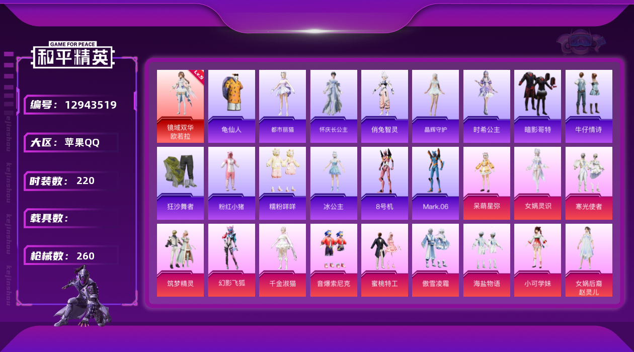 - [13925460]实名: 可修改 时装数: 675 载具数: 4 枪械数: 255 战备数: 217 热门装扮: 未来战士,深海小丑鱼,深海曼妙,缤纷油彩,甜蜜誓约,花间之火,童趣迷兔,雪国幻梦,馨动时刻,巡查员衣服,精灵娃娃,酣梦娃娃,甜心娃娃,甜梦小狐,寒光使者,冰川粉黛,冰川幽秘,潮萌小黄鸭,激萌罗小黑,动感兔斯基,兔兔白日梦,派对舞王,仲夏莫吉托,诡夜天鹅,第五大道,小可学妹,白勺歌姬,傲傲奶龙,蜜语绒猫,小蓝,金丰海韵,幻彩电音,狂魅哈莉,绯月迷踪,羊梦糖心 载具: 星梦玉骢,宝马M4(圣保罗黄),保时捷Taycan旅行版(冰莓粉),冰绡玉鳞 稀有枪皮: M762甜心娃娃,M416暖熊萌萌,UMP45启明星,SCAR-L纯梦嫁纱,M417第五大道,Kar98K未来歌姬,AUG超新星,MG3酷泡奶龙,AKM绿萝繁花,SPAS-12蜜语绒猫,PKM江南烟雨,P90-金丰海韵,GROZA-镜光银凌,Kar98K-巳巳如意,AUG-暖羊咩咩,破片手榴弹-热量炸弹,AKS-74U-星穹咏叹调,MK14-甜梦熊击,烟雾弹-甜梦果泡,MG-36-幻彩电音,Vector-最终圣卫者,汤姆逊-热量炸弹,M416-灵猫魔法师,DP-28-豹影疾电,P90-魔童闹海 敖丙