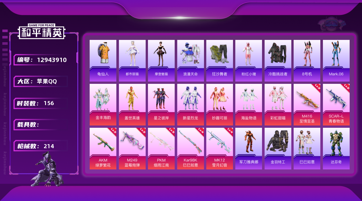 [12943910]暑期末清货/特价急出/永久包赔地铁满天赋/M416-至情至圣(九级)苹果 手Q-8粉装-7特效枪-0载具-6.6w热力值-16印记-156套装-214枪皮【热门品类】:套装-深海小丑鱼,角色-军刀雅典娜,套装-金羽特工,套装-都市猎人,套装-动感兔斯基人偶服【特效枪等级】:AKM-绿萝繁花(五级),SCAR-L-青春物语(六级),M416-至情至圣(九级),Kar98K-巳巳如意(四级),MK12-雪月幻音(四级),M249-蓝莓炮弹(五级),PKM-江南烟雨(五级)【优质套装】:粉装-梦幻火箭,粉装-新星烈龙,粉装-星之彼岸,粉装-海盐物语,粉装-妙趣可丽,粉装-彩虹甜喵,粉装-盖世英雄,粉装-金丰海韵【优质飞行器】:千面幻镜飞行器,龙翔九天飞行器,英伦信使飞行器