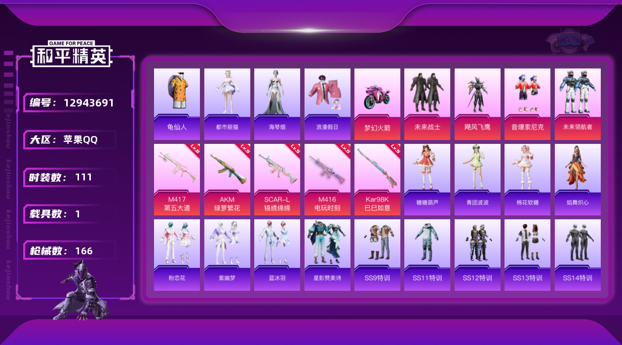 [12943691]【暑期末清货/特价急出/永久包赔】:苹果 手Q-4粉装-5特效枪-1载具-5.1w热力值-7印记-111套装-166枪皮【稀有载具】:双人摩托-梦幻火箭【特效枪等级】:AKM-绿萝繁花(五级),SCAR-L-锦绣绵绵(五级),M416-电玩时刻(五级),Kar98K-巳巳如意(五级),M417-第五大道(六级)【优质套装】:粉装-未来战士,粉装-飓风飞鹰,粉装-音爆索尼克,粉装-未来领航者【优质飞行器】:沙丘之主天马,英伦信使飞行器