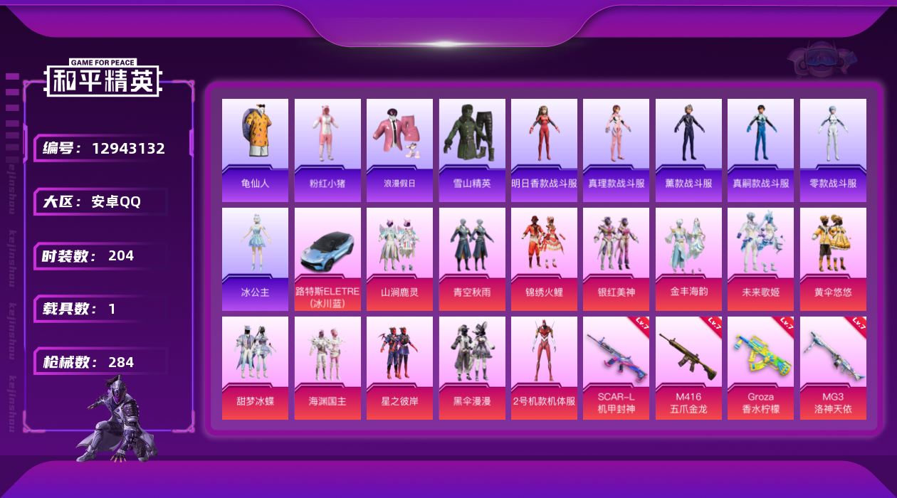 [12943132]身法素材号【特价急出/详情看图】:安卓 手Q-12粉装-9特效枪-1载具-1粉色飞行器-101284热力值-14王牌印记-204套装-284枪皮