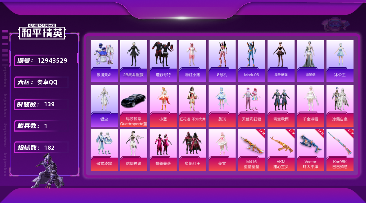 [12943529]M416-至情至圣(九级)!安卓 手Q-13粉装-9特效枪-1载具-4粉色飞行器-58596热力值-11王牌印记-139套装-182枪皮 【热门品类】:粉装-梦幻火箭,套装-浪漫天命,角色-军刀雅典娜,角色-2B战斗服款,套装-暗影哥特,套装-粉红小猪,角色-8号机,角色-Mark.06 【粉色载具】:玛莎拉蒂Quattroporte(夜幕蓝) 【粉色套装】:粉装-天使彩虹糖,粉装-梦幻火箭,粉装-冰霜白皇,粉装-炙焰红王,粉装-蝶舞蔷薇,粉装-傲雪凌霜,粉装-青空秋雨,角色-小蓝,角色-美雪,角色-美琪,角色-狂花道·不知火舞,角色-千金淑猫,角色-信仰神谕 【粉色枪皮等级】:AKM-甜心宝贝(五级),SCAR-L-青春物语(四级),M416-至情至圣(九级),Vector-环太平洋(五级),Kar98K-巳巳如意(五级),Mk14-盛世惊鸿(三级),M249-彩虹甜喵(二级),DP-28-豹影疾电(三级),PKM-江南烟雨(一级) 【粉色枪皮】:AKM-甜心宝贝,SCAR-L-青春物语,M416-至情至圣,Vector-环太平洋,Kar98K-巳巳如意,Mk14-盛世惊鸿,M249-彩虹甜喵,DP-28-豹影疾电,PKM-江南烟雨 【粉色飞行器】:童趣迷兔飞行器,镜域双华-灵镜之阶,龙翔九天飞行器,幽焰列车飞行器 【粉色降落伞】:甜心宝贝降落伞,梦幻火箭降落伞,童趣迷兔降落伞,青春物语降落伞,星夜魔法师降落伞,圣光天使降落伞,垂柳戏鸭降落伞,彩虹甜喵降落伞,镜域双华降落伞,精灵梦叶罗丽降落伞,幽焰骑士降落伞,千金淑猫降落伞 【稀有套装】:套装-糖糖葫芦,套装-青团波波,套装-棉花软糖,角色-摩登魅猫,套装-裁决天象,套装-黑曜寓言,套装-燕燕于飞,套装-鱼渊荷华,角色-风玲,角色-海琴烟 【稀有枪皮】:AKM-彩虹符号,AKM-破晓战魂,AKM-龙的传人,AKM-玄冥寒域,M16A4-幻世战舞者,M16A4-甜心亚梦,SCAR-L-夜灯,SCAR-L-炫彩节奏,SCAR-L-玉兔迎春,SCAR-L-小狗蛇点点,SCAR-L-冷漠罗丽,M416-糯团青竹,M416-紫翼圣骑,GROZA-彩虹符号,GROZA-恐龙拽拽,GROZA-田园牧歌,GROZA-紫翼圣骑,AUG-天降萌叽,AUG-耀粉歌者,AUG-青春冒险家,QBZ-彩虹符号,QBZ-飞驰魅影,M762