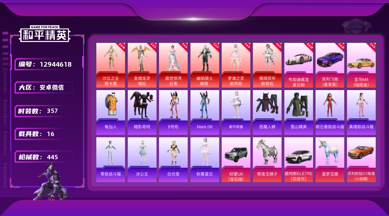 [12944618]老101!4级图卡盟!1级瑞拉妮芮妲欧若拉维塔!安卓 微信-6神装-52粉装-24特效枪-16载具-25粉色飞行器-223851热力值-22王牌印记-357套装-445枪皮 【红色载具】:宾利飞驰(皇家紫)(二级),布加迪威龙(星云粉)(二级),宝马M4(灿阳金)(一级) 【红色神装等级】:圣域龙灵-瑞拉(一级),盛世惊鸿-云鸾(一级),幽焰骑士-维塔(一级),梦海之灵-妮芮妲(一级),镜域双华-欧若拉(一级),沙丘之主-图卡盟(四级) 【红色角色神装】:圣域龙灵-瑞拉,盛世惊鸿-云鸾,幽焰骑士-维塔,梦海之灵-妮芮妲,镜域双华-欧若拉,沙丘之主-图卡盟 【热门品类】:粉装-梦幻火箭,套装-火箭少女101,套装-奇异狩猎者,角色-军刀雅典娜,套装-胖达圆圆,角色-忠猛周仓,角色-忠真马岱,角色-忠义严颜,套装-龟仙人,套装-暗影哥特,角色-8号机,角色-Mark.06,小恶魔头饰,大砍刀-青龙偃月刀,撬棍-龙胆亮银枪 【粉色载具】:特斯拉Roadster(水滴蓝),路特斯EVIJA(星际黄),路特斯ELETRE(花绽灰),宾利欧陆GT敞篷(火焰橘),宾利飞驰(皇家紫),仰望U7(阿盖尔紫),仰望U8(龙石绿),宝马M4(灿阳金),迈凯伦570S(天际蓝),布加迪威龙(星云粉),擎天重拳,合金龙骨(蓝),双人摩托-梦幻火箭,僚机-萌兔起飞,僚机-萌酷奶龙,赤兔,照夜玉狮子,星梦玉骢 【粉色套装】:粉装-深渊皇后,粉装-梦幻火箭,粉装-草莓生巧,粉装-冰霜白皇,粉装-炙焰红王,粉装-香水柠檬,粉装-暗翼战神,粉装-王牌四分卫,粉装-馨动时刻,粉装-山涧鹿灵,角色-洛天依,角色-初号机款机体服,粉装-蓝莓炮弹,粉装-精灵娃娃,粉装-海盐物语,粉装-恐龙拽拽,粉装-绚丽摇曳,粉装-闪耀律动,粉装-橘柚倾心,粉装-赤焰黑爵,粉装-紫电风暴,粉装-炙焰牛王,粉装-星夜魔法师,粉装-傲雪凌霜,粉装-霁雪冰心,粉装-彩虹甜喵,粉装-旋转彩虹,粉装-冰川粉黛,粉装-冰川红玫,粉装-霞光圣骑,粉装-寒光使者,粉装-暗夜鎏金,粉装-第五大道,粉装-雪梅暗香,粉装-心之回忆,超级赛亚人-贝吉塔,角色-白勺歌姬,角色-呆萌星弥,角色-小可学妹,粉装-炎氏战神,粉装-未来歌姬,角色-猩猩队长,粉装-闲梦青缨,角色-白兰星,粉装-憨憨奶龙,粉装-傲傲奶龙,角色-圣堂之誓,角色-美雪,角色-超弦