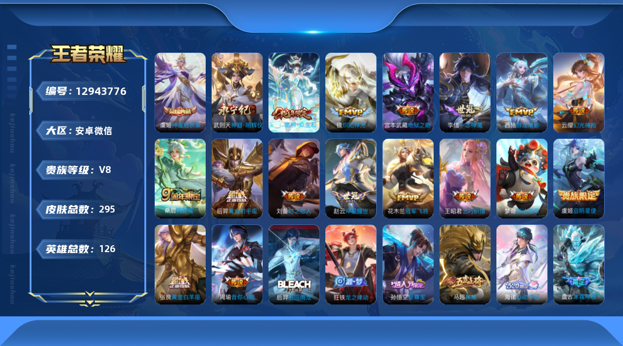 [12943776]AK671安卓WX-V8-最强王者段位-126英雄-295皮肤-1典藏-0珍品无双-1无双-0珍品传说-16传说-79史诗