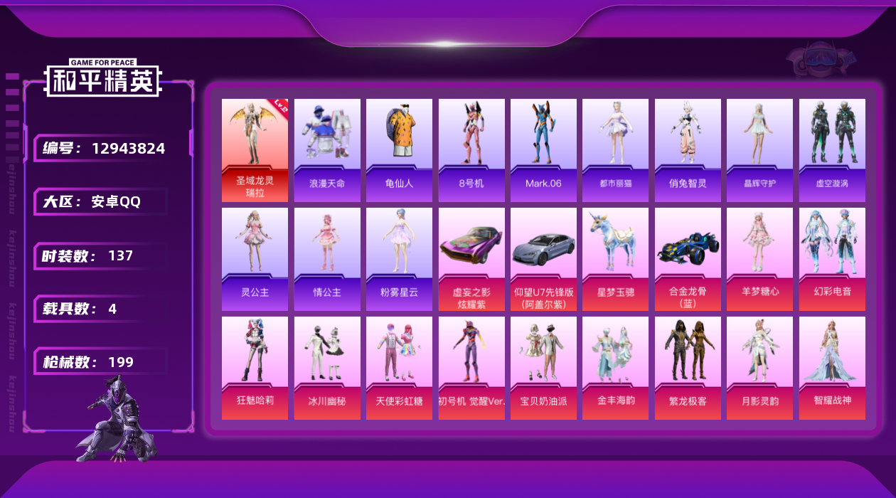 [12943824]安卓 手Q-1神装-12粉装-12特效枪-4载具-17粉色飞行器-75568热力值-9王牌印记-137套装-199枪皮