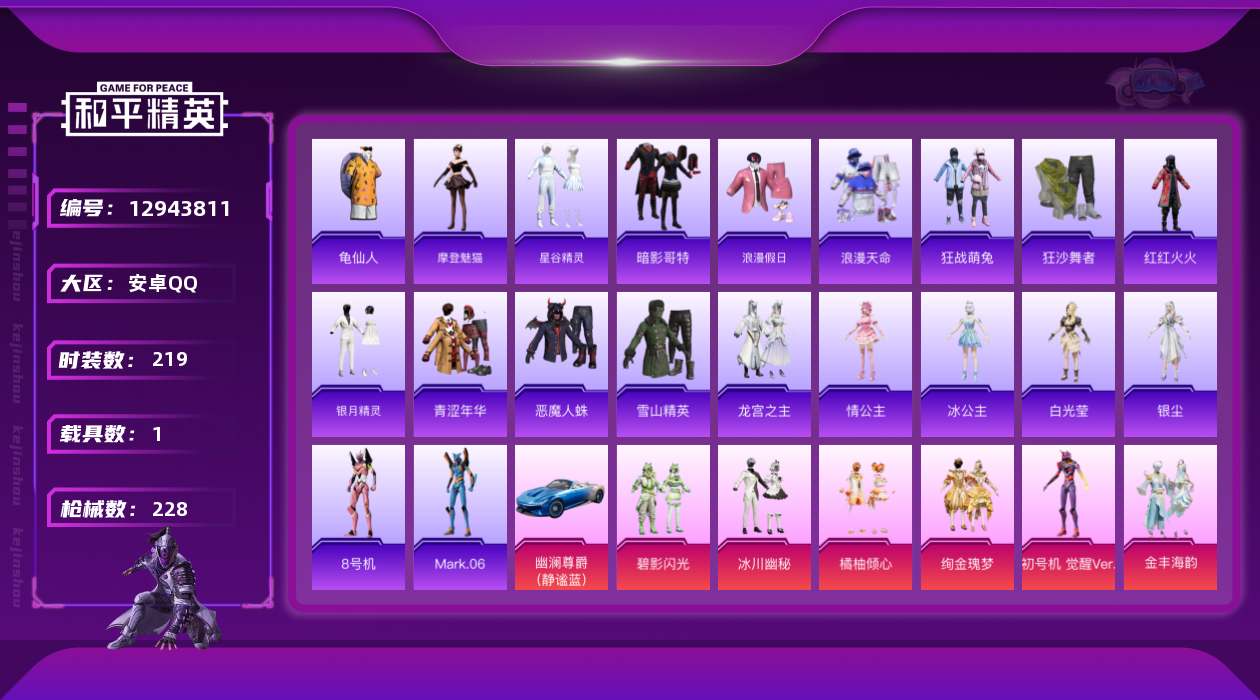 [12943811]暑期末清货/特价急出/永久包赔安卓 手Q-12粉装-7特效枪-1载具-8.4w热力值-10印记-219套装-228枪皮【热门品类】:绝对防御上衣【稀有载具】:幽澜尊爵(静谧蓝)【特效枪等级】:AKM-绿萝繁花(五级),SCAR-L-万古烈焰(三级),UMP45-量子极限(五级),P90-金丰海韵(五级),Kar98K-巳巳如意(四级),Mini14-绚金瑰梦(七级),MG3-洛神天依(七级)【优质套装】:粉装-绚金瑰梦,粉装-碧影闪光,粉装-橘柚倾心,粉装-傲雪凌霜,粉装-冰川幽秘,粉装-暗夜鎏金,粉装-黄族统领,粉装-炫光之旅,角色-宙之时溯,角色-星云暗核,角色-初号机 觉醒Ver.,粉装-金丰海韵【优质飞行器】:绒雪飘舞飞行器,黄族统领飞行器