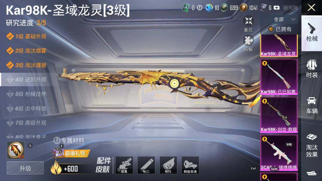 【粉色枪皮等级】:SCAR-L-锦绣绵绵(五级),M416-风花雪月(四级),AKS-74U-星穹咏叹调(三级),Kar98K-创世·救赎(五级),Kar98K-巳巳如意(一级),Kar98K-圣域龙灵(三级),M417-第五大道(七级),M249-彩虹甜喵(六级),MG-36-幻彩电音(二级),烟雾弹-甜梦果泡(五级)