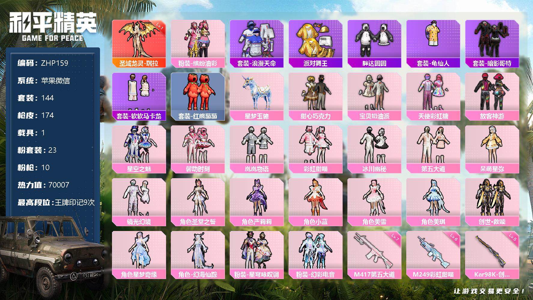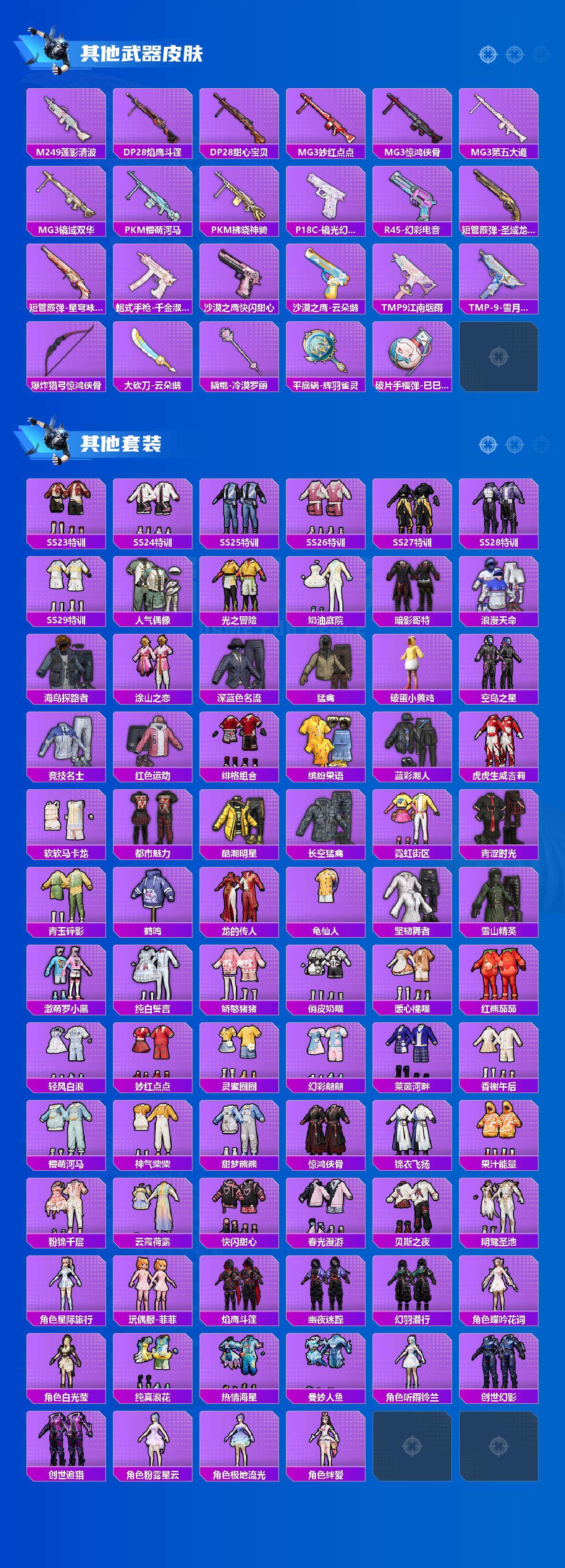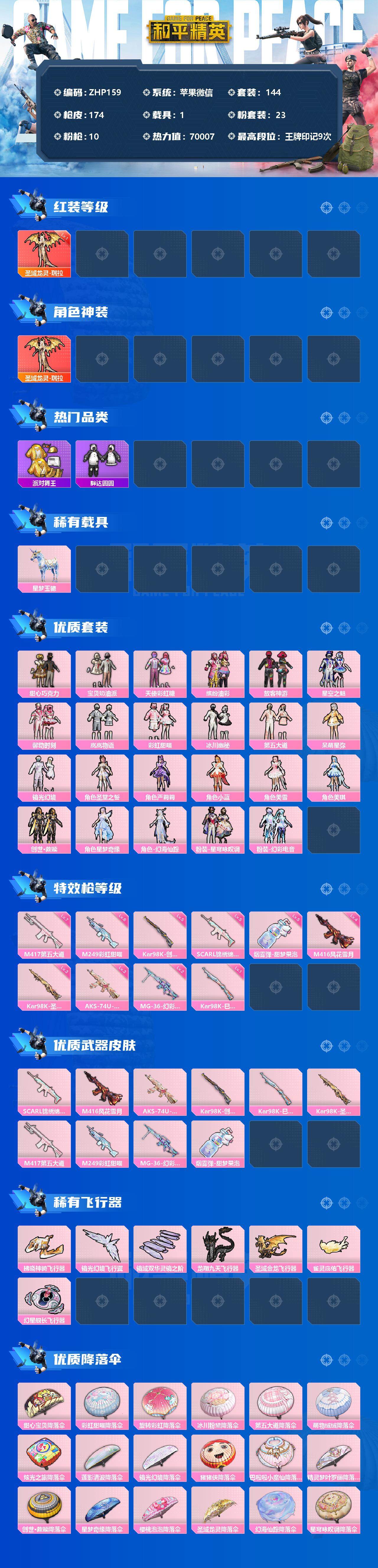 [12944698]1级瑞拉!猪妹放客巧克力三姐妹!哥特金鞋苹果 微信-1神装-23粉装-10特效枪-1载具-7粉色飞行器-70007热力值-9王牌印记-144套装-174枪皮 【红色神装等级】:圣域龙灵-瑞拉(一级) 【红色角色神装】:圣域龙灵-瑞拉 【热门品类】:粉装-缤纷油彩,套装-浪漫天命,套装-派对舞王,套装-胖达圆圆,套装-龟仙人,套装-暗影哥特,套装-软软马卡龙,套装-红熊茄茄 【粉色载具】:星梦玉骢 【粉色套装】:粉装-甜心巧克力,粉装-宝贝奶油派,粉装-天使彩虹糖,粉装-缤纷油彩,粉装-放客神游,粉装-星空之魅,粉装-馨动时刻,粉装-岚岚物语,粉装-彩虹甜喵,粉装-冰川幽秘,粉装-第五大道,角色-呆萌星弥,粉装-镜光幻境,角色-圣堂之誓,角色-严莉莉,角色-小蓝,角色-美雪,角色-美琪,套装-创世·救赎,角色-星梦奇缘,角色-幻海仙踪,粉装-星穹咏叹调,粉装-幻彩电音 【粉色枪皮等级】:SCAR-L-锦绣绵绵(五级),M416-风花雪月(四级),AKS-74U-星穹咏叹调(三级),Kar98K-创世·救赎(五级),Kar98K-巳巳如意(一级),Kar98K-圣域龙灵(三级),M417-第五大道(七级),M249-彩虹甜喵(六级),MG-36-幻彩电音(二级),烟雾弹-甜梦果泡(五级) 【粉色枪皮】:SCAR-L-锦绣绵绵,M416-风花雪月,AKS-74U-星穹咏叹调,Kar98K-创世·救赎,Kar98K-巳巳如意,Kar98K-圣域龙灵,M417-第五大道,M249-彩虹甜喵,MG-36-幻彩电音,烟雾弹-甜梦果泡 【粉色飞行器】:拂晓神骑飞行器,镜光幻境飞行翼,镜域双华-灵镜之阶,龙翔九天飞行器,圣域金龙飞行器,雀灵庇佑飞行器,幻星舰长飞行器 【粉色降落伞】:甜心宝贝降落伞,彩虹甜喵降落伞,旋转彩虹降落伞,冰川粉黛降落伞,第五大道降落伞,萌物绒绒降落伞,炫光之旅降落伞,莲影清波降落伞,镜光幻境降落伞,猪猪侠降落伞,巴啦啦小魔仙降落伞,精灵梦叶罗丽降落伞,创世·救赎降落伞,星梦奇缘降落伞,樱桃泡泡降落伞,圣域龙灵降落伞,幻海仙踪降落伞,星穹咏叹调降落伞,幻星舰长降落伞,幻彩电音降落伞 【稀有套装】:套装-龟仙人,套装-巳巳如意,套装-小鸟芋圆,角色-光矢逐梦,套装-燕燕于飞,套装-鱼渊荷华,角色-蜜桃派对,套装-粉恋花,套装-紫幽梦,套装-蓝冰羽,角色-猎影月
