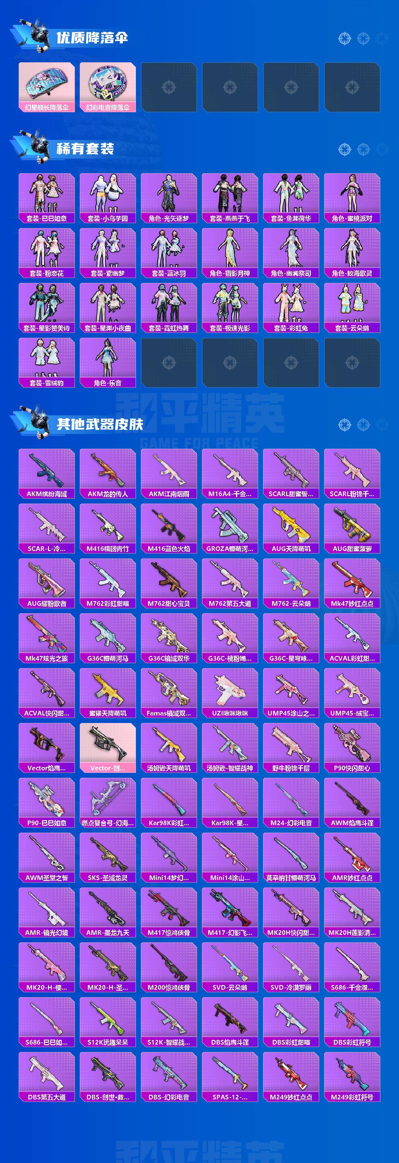 【粉色枪皮】:SCAR-L-锦绣绵绵,M416-风花雪月,AKS-74U-星穹咏叹调,Kar98K-创世·救赎,Kar98K-巳巳如意,Kar98K-圣域龙灵,M417-第五大道,M249-彩虹甜喵,MG-36-幻彩电音,烟雾弹-甜梦果泡