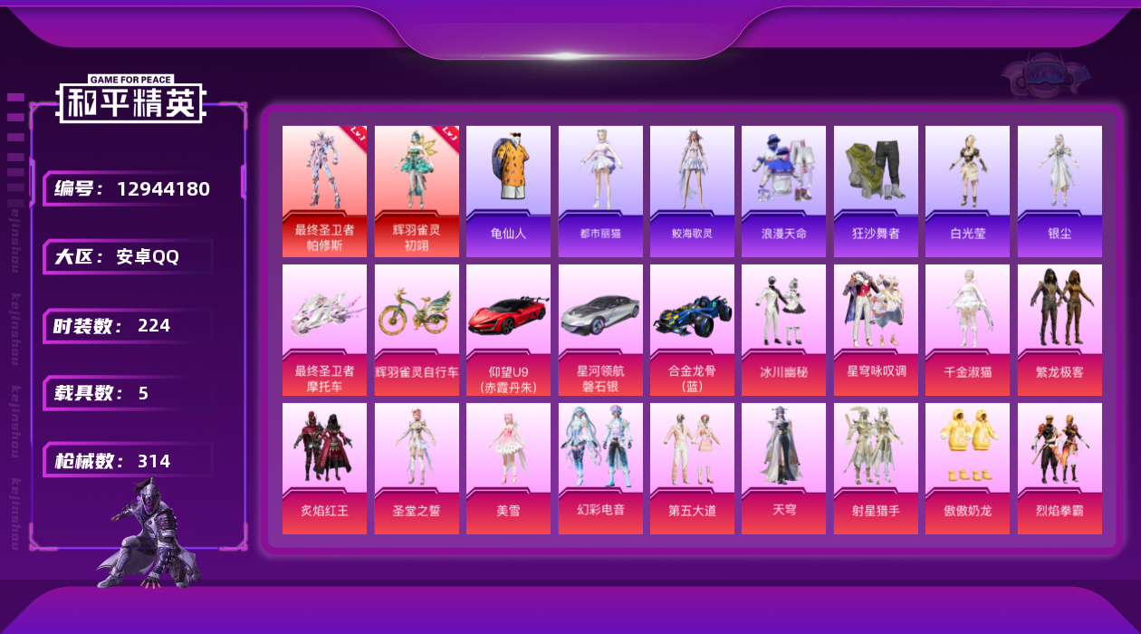 - PX_2083193- 苹果手Q-17王牌印记-12粉装-10特效枪-1载具-87802热力值-183套装-240枪皮-0卓越印记-0传奇印记 【12粉装】,雪国幻梦,梦幻火箭,初号机 觉醒Ver.,宝贝奶油派,放客神游,星穹咏叹调,极致幻想,焦糖拿铁,冰炎战车,智能音符,莲影清波,银刃赛罗 【10特效枪】AKM-梦之光华-6级 SCAR-L-锦绣绵绵-5级 SCAR-L-金蛇镇世-3级 M416