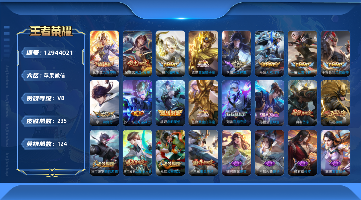 [12944021]AK736苹果WX-V8-至尊星耀III段位-124英雄-235皮肤-1典藏-0珍品无双-0无双-0珍品传说-11传说-58史诗
